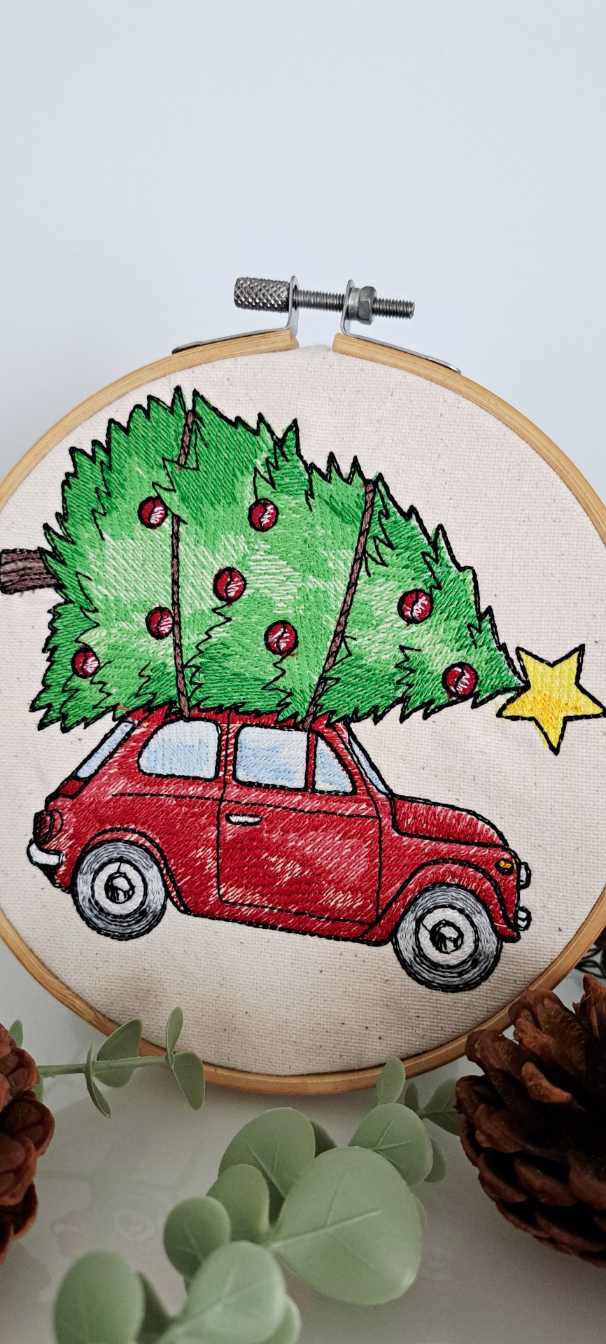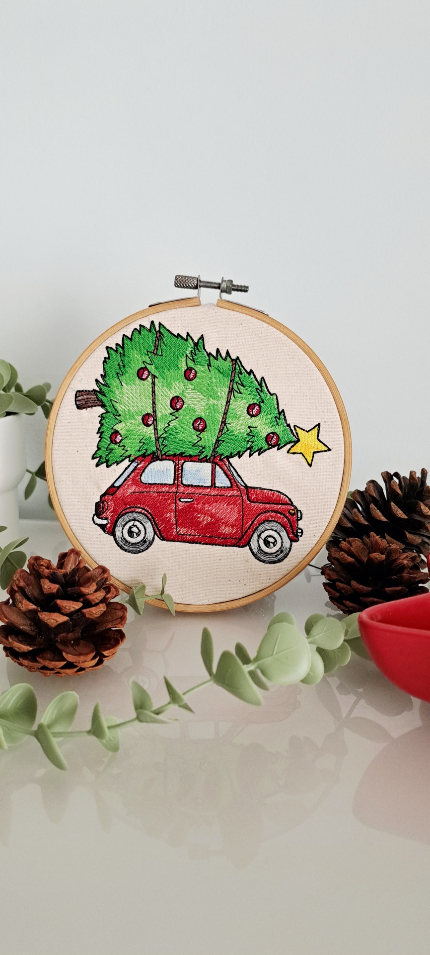 • Bastidor com bordado de carro vermelho e árvore de Natal