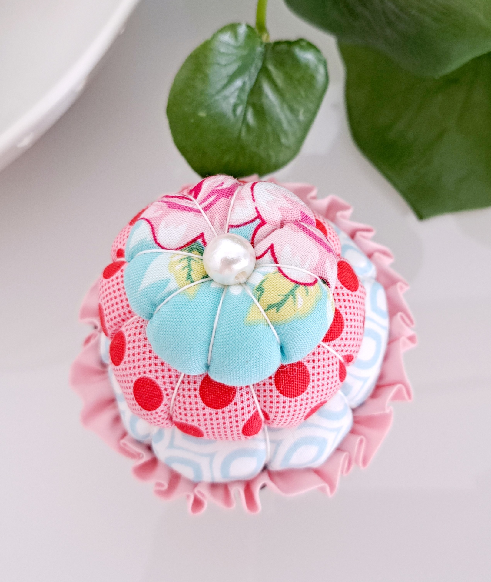 • Alfineteiro de tecido colorido com pérola no centro e folha verde ao fundo