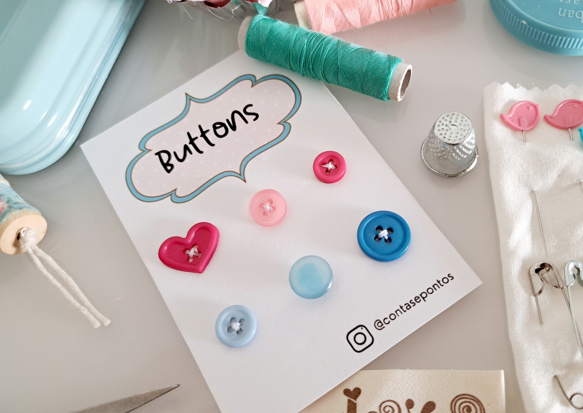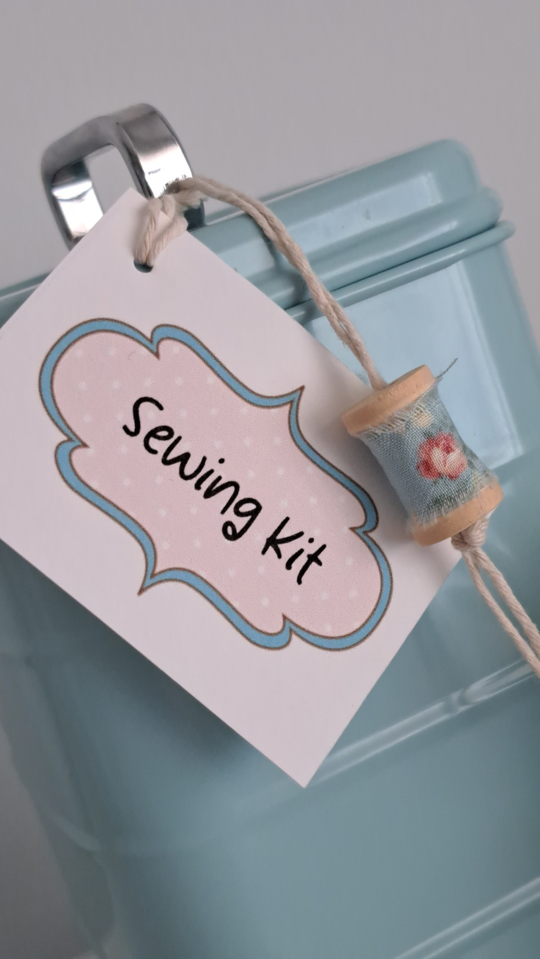 • Kit de costura com máquina azul, botões, alfineteiro cupcake e acessórios