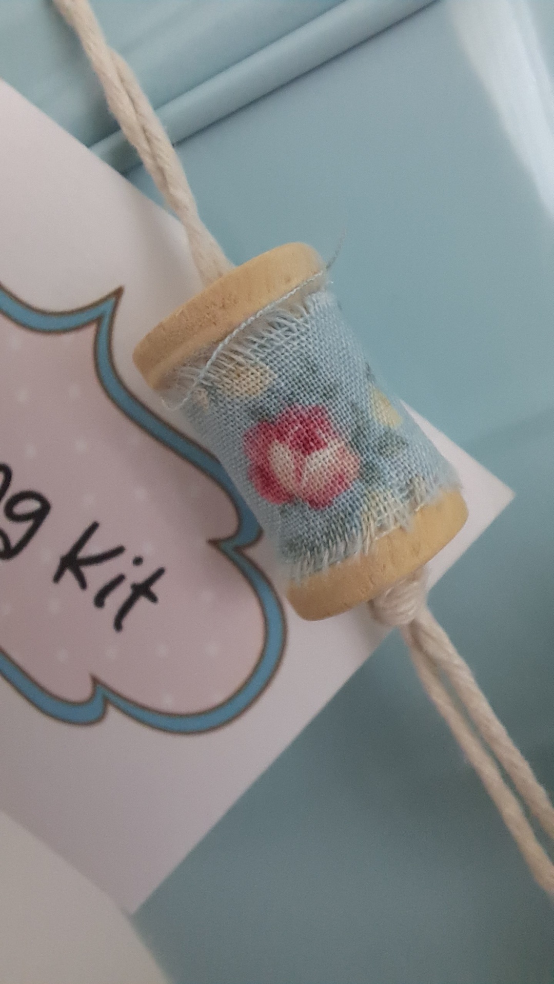 • Roldana de madeira com tecido floral azul ligada a corda branca