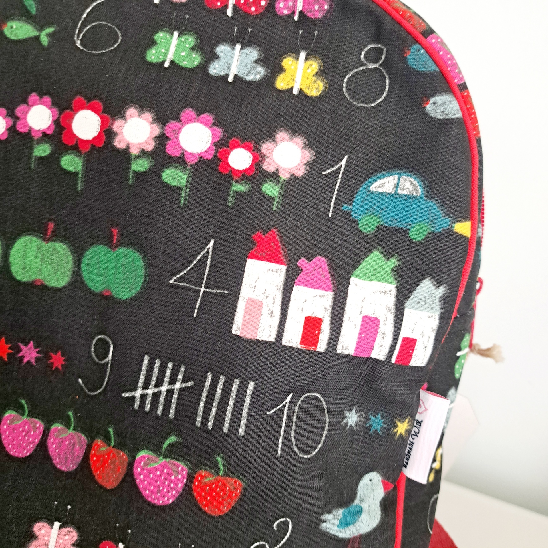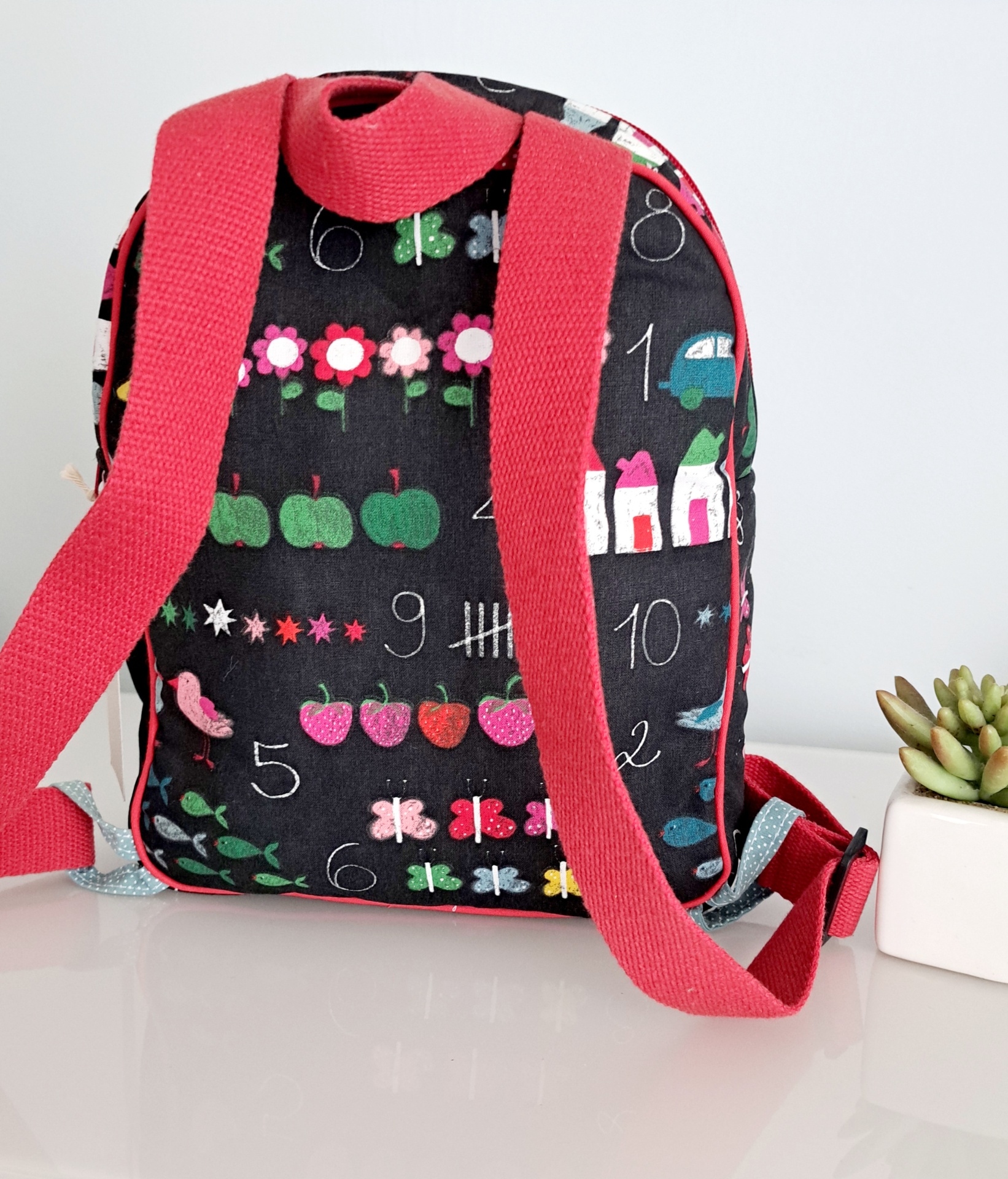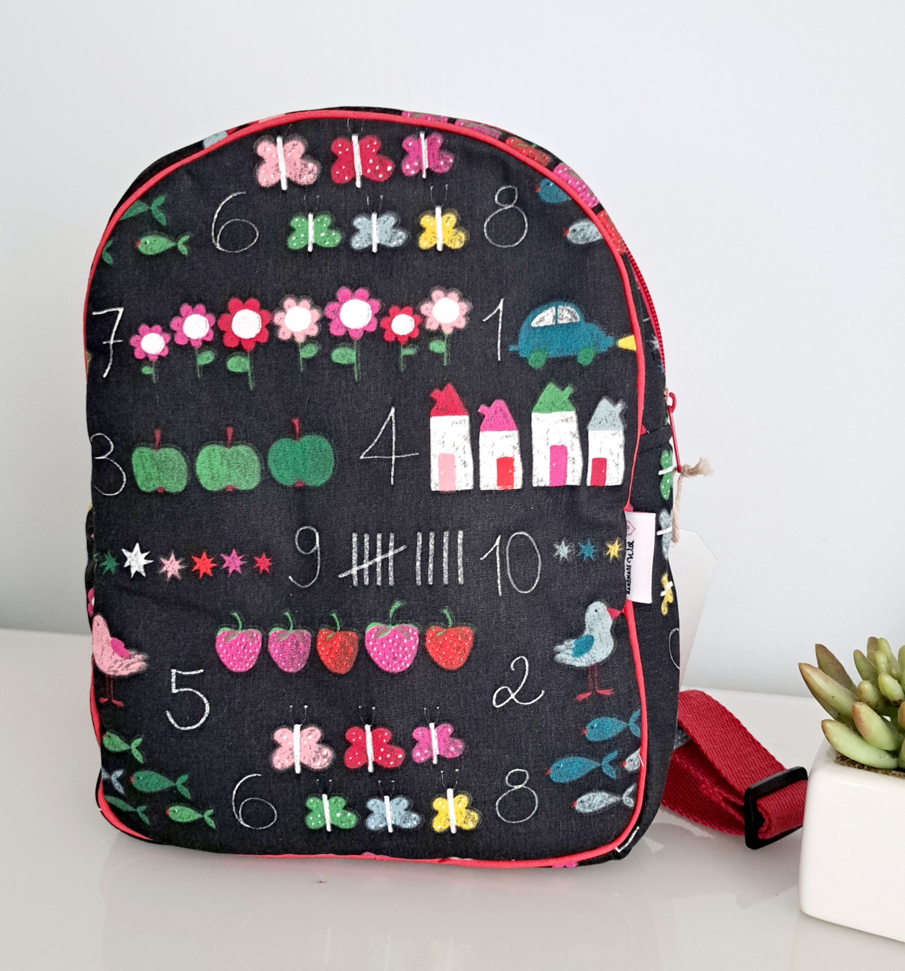 • Mochila infantil preta com números e desenhos coloridos educativos