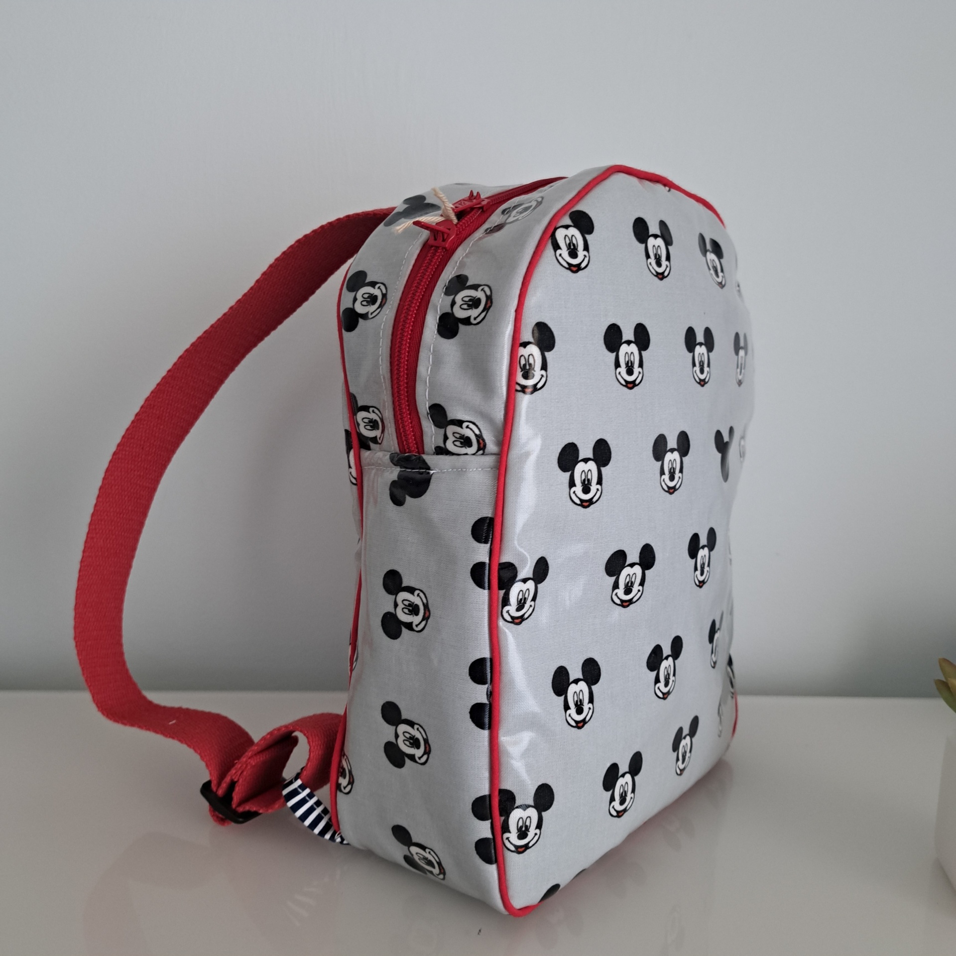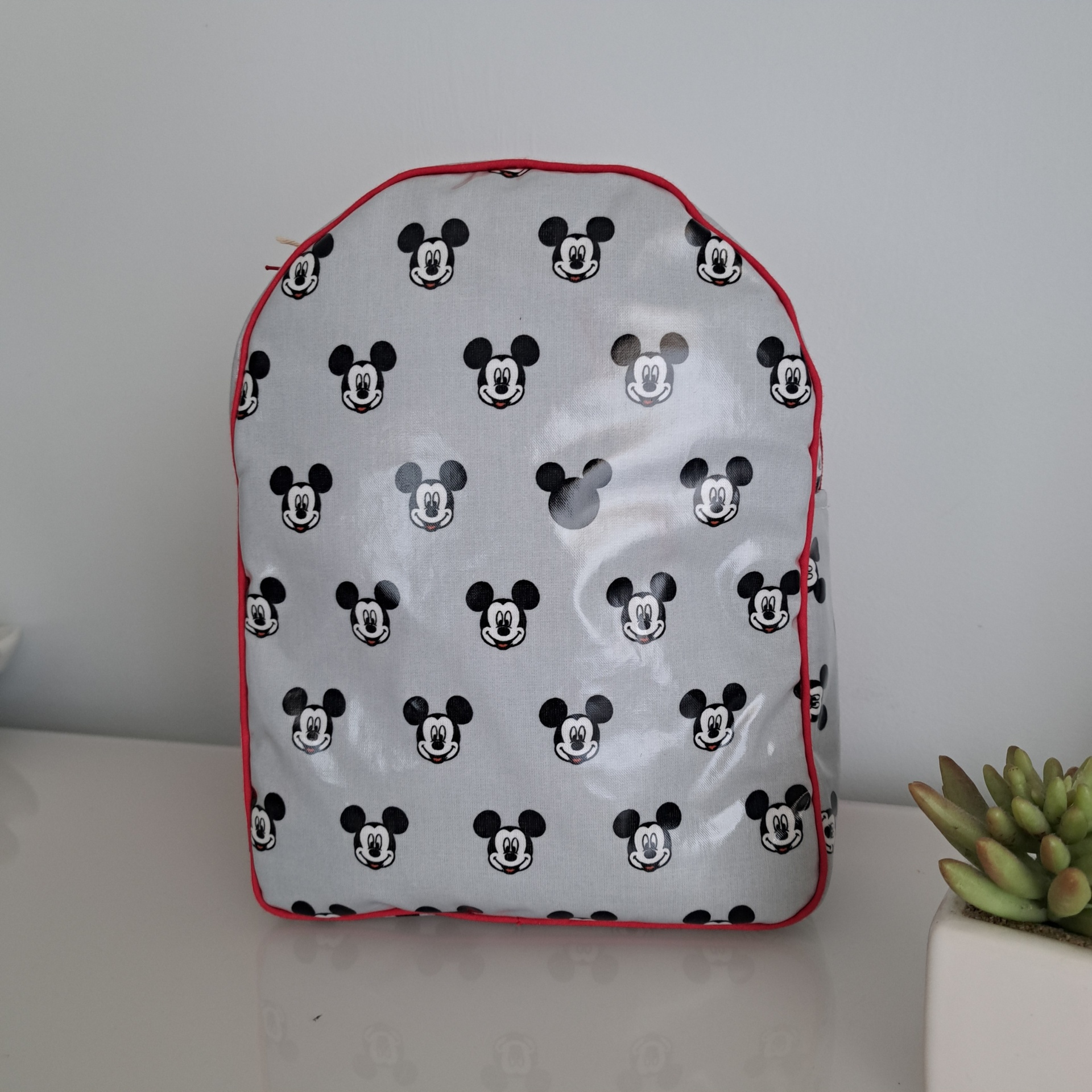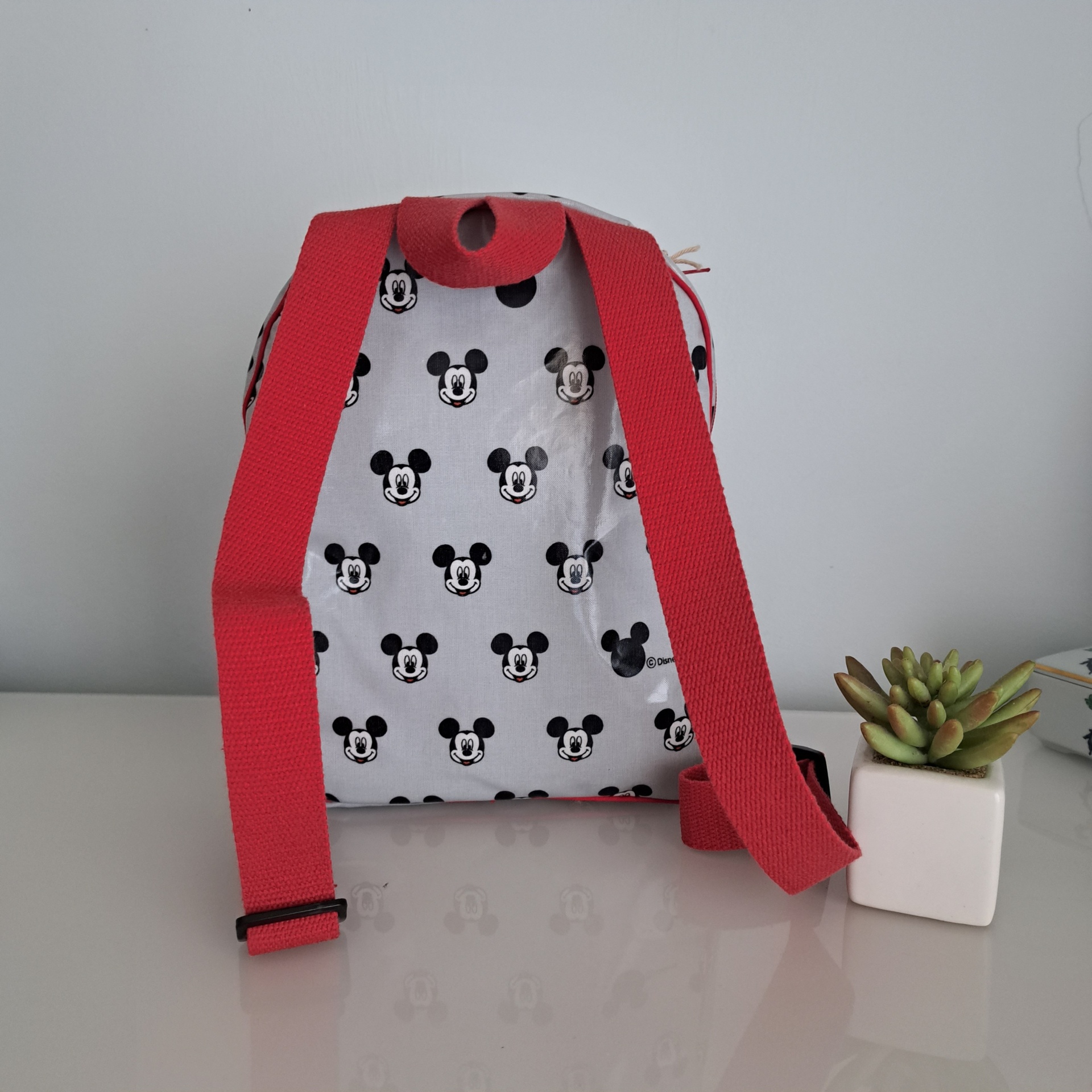 • Mochila branca com padrão de Mickey Mouse e alças vermelhas ao lado de vaso com suculenta