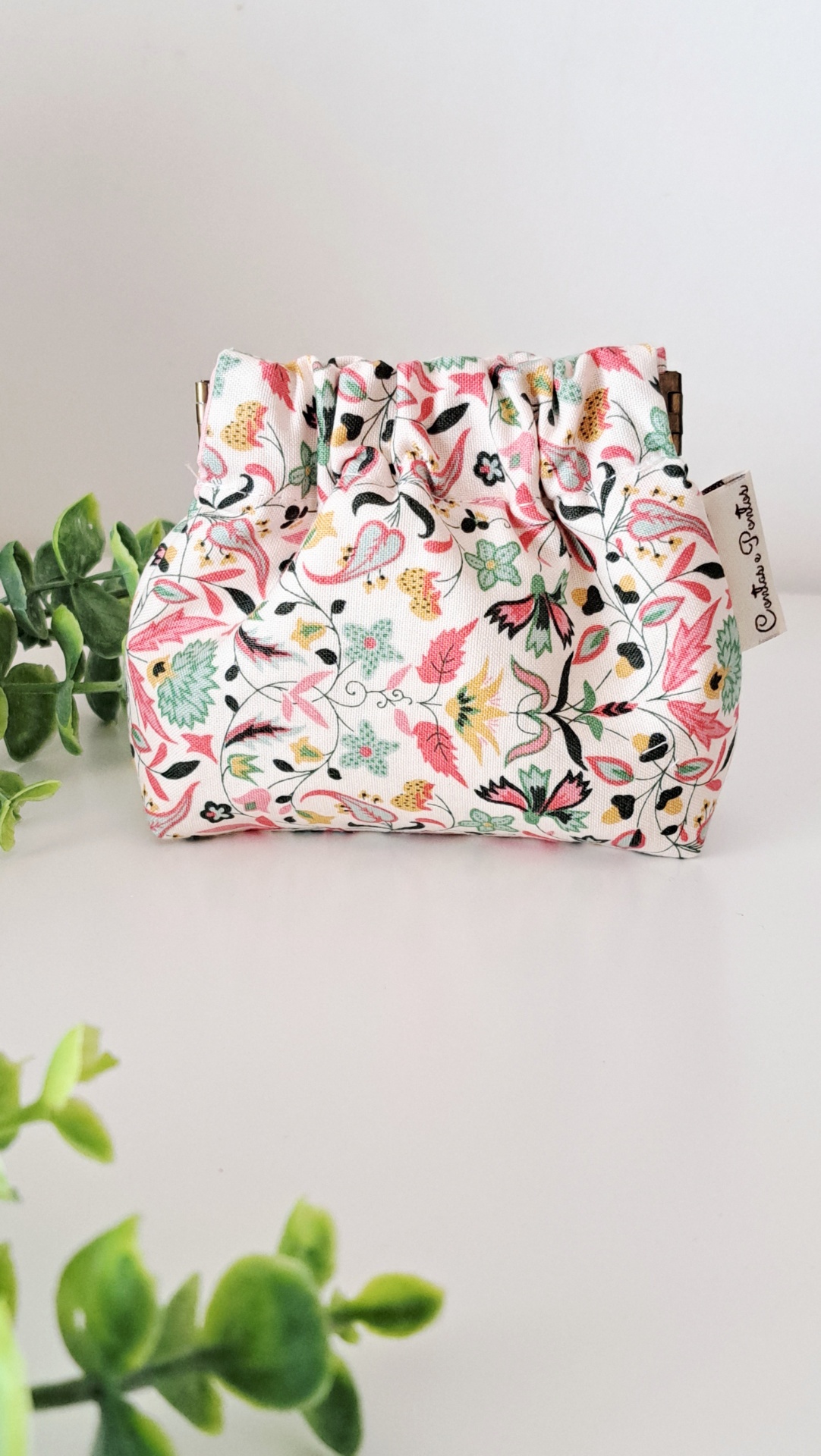 • Bolsa pequena de tecido floral com interior rosa bolinhas