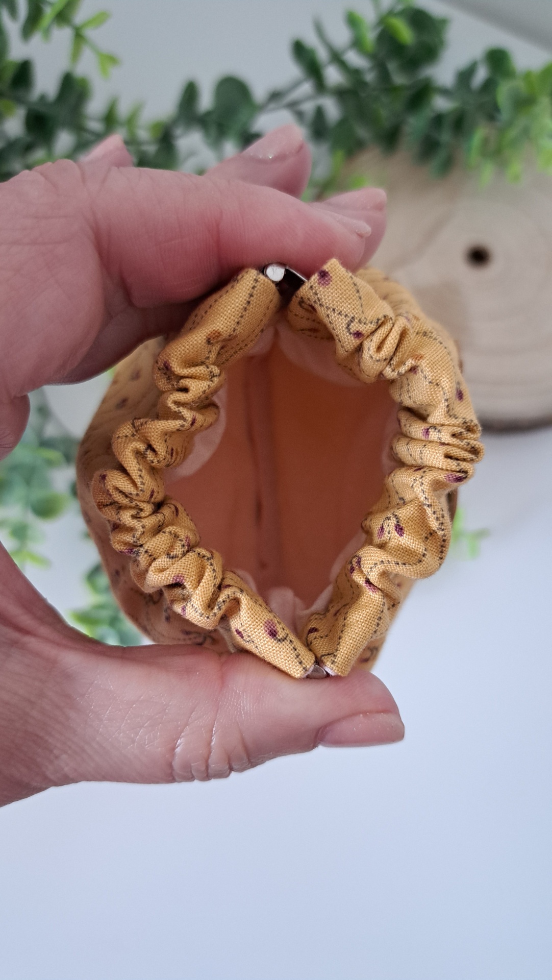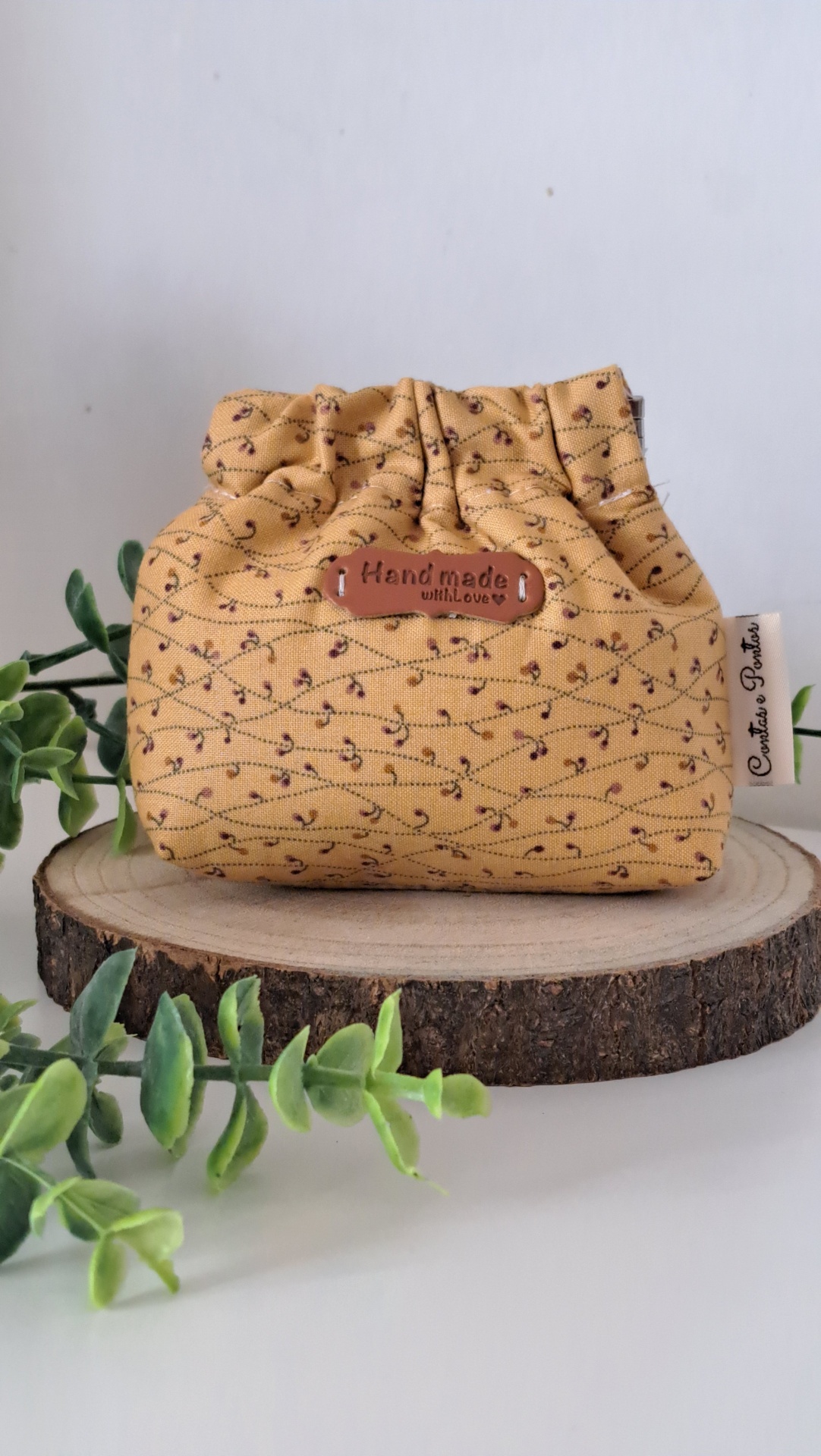 • Bolsa pequena de tecido amarelo com padrão floral castanho, com fecho tipo mola