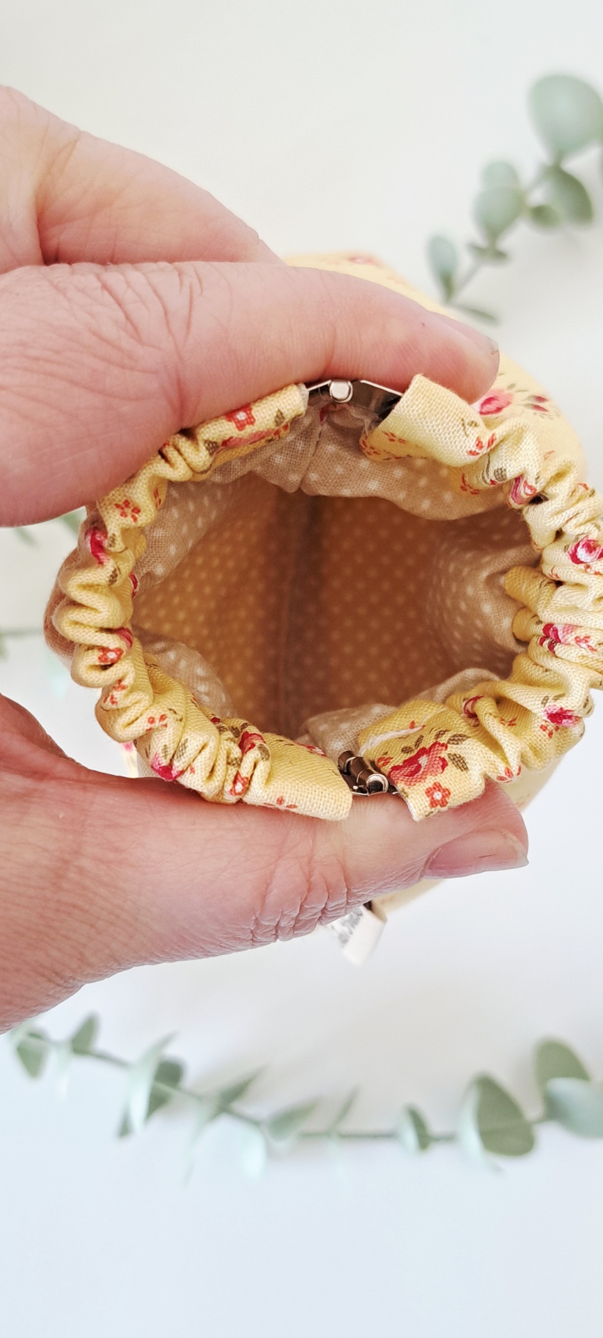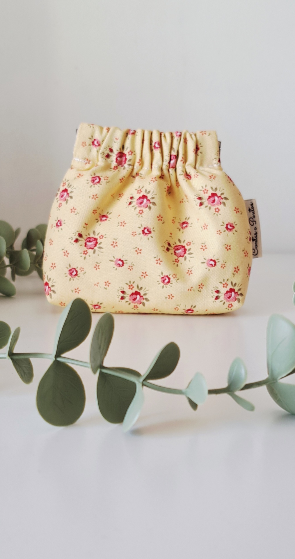• Necessaire de tecido amarelo claro com flores rosas e fecho elástico.