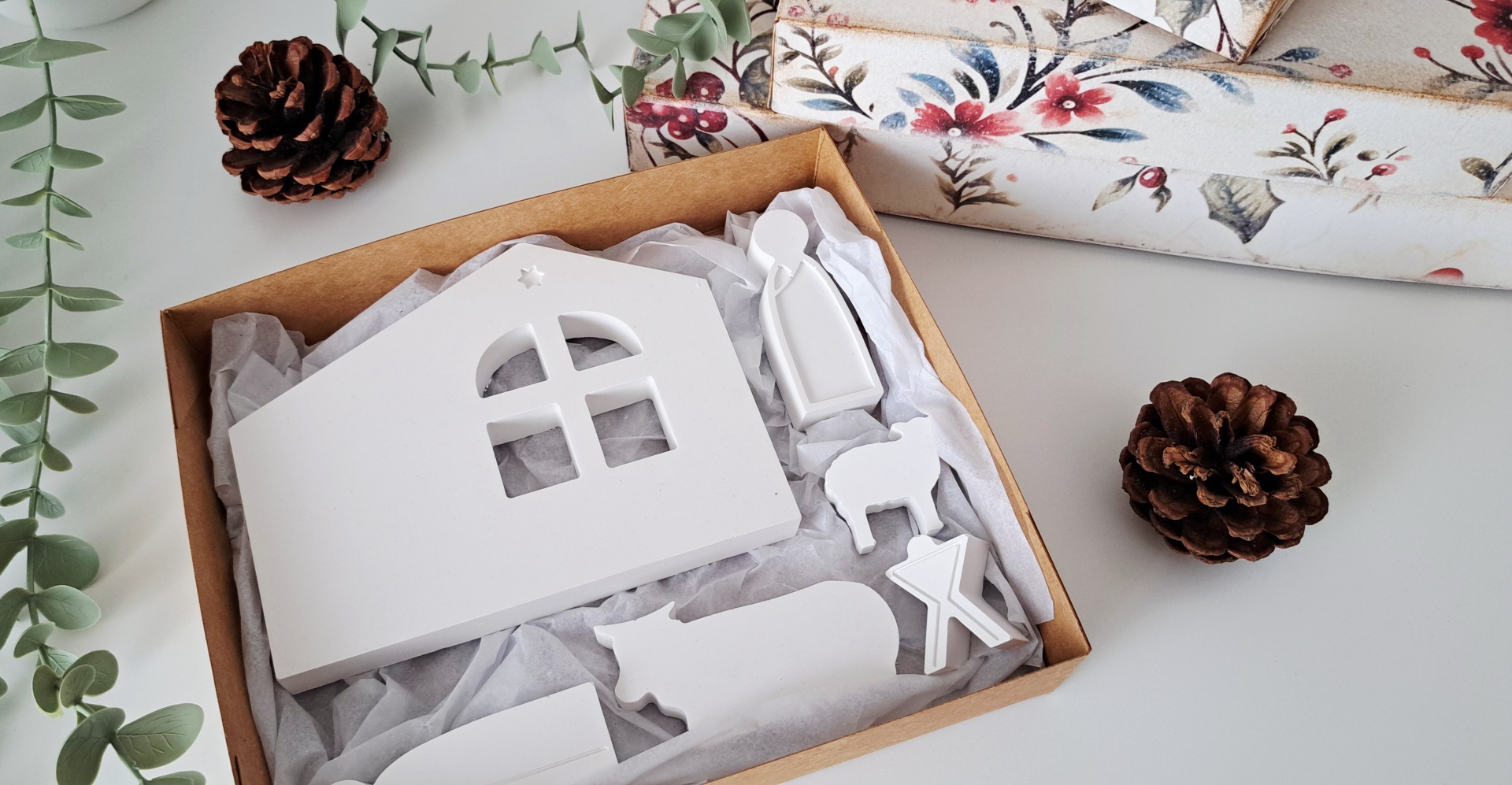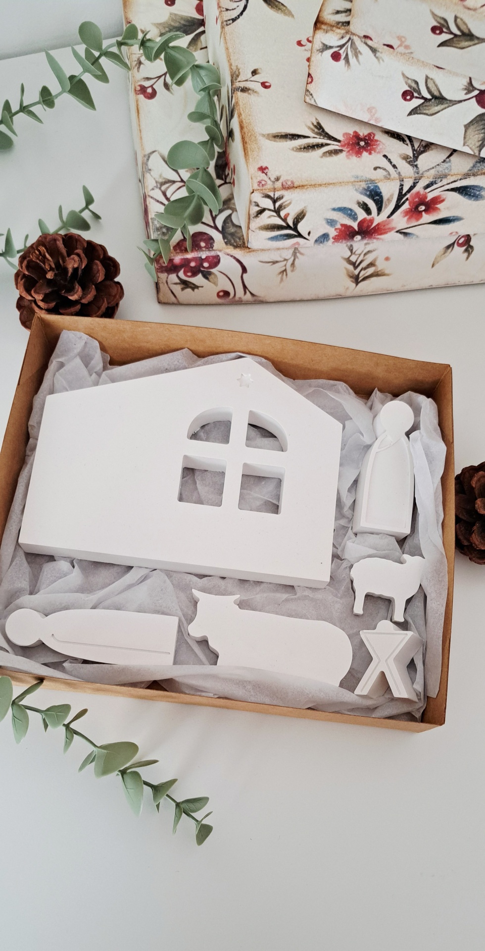 ♥ Caixa de cartão para usar como embalagem de presente e que poderá ser usado para guardar o presépio até à época natalicia seguinte.
