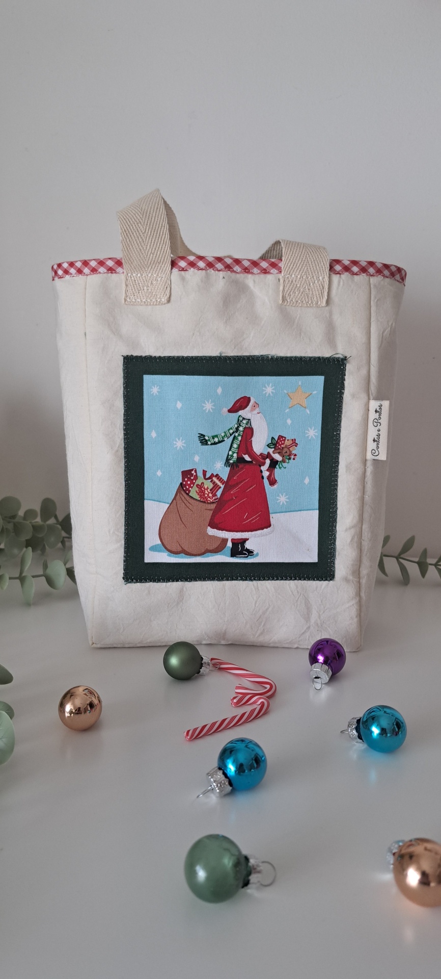 Saco de Natal 🎄 8,00 € Desconto de %. Partilhar Comprar Contactar 1 unidades em stock Ideais para oferecer com uns chocolatinhos, uma chávena, uns bolinhos, umas meias, um pijama quentinho... São únicos porque a estampa é sempre diferente❤️ ♥ Dimensão aprox. 16 x 21,5 x 8 cm ♥ Tecidos interior e exterior 100% algodão Recomendada lavagem à mão ♥ ♥Handmade with love♥ Tags Saco de natalideia de presente