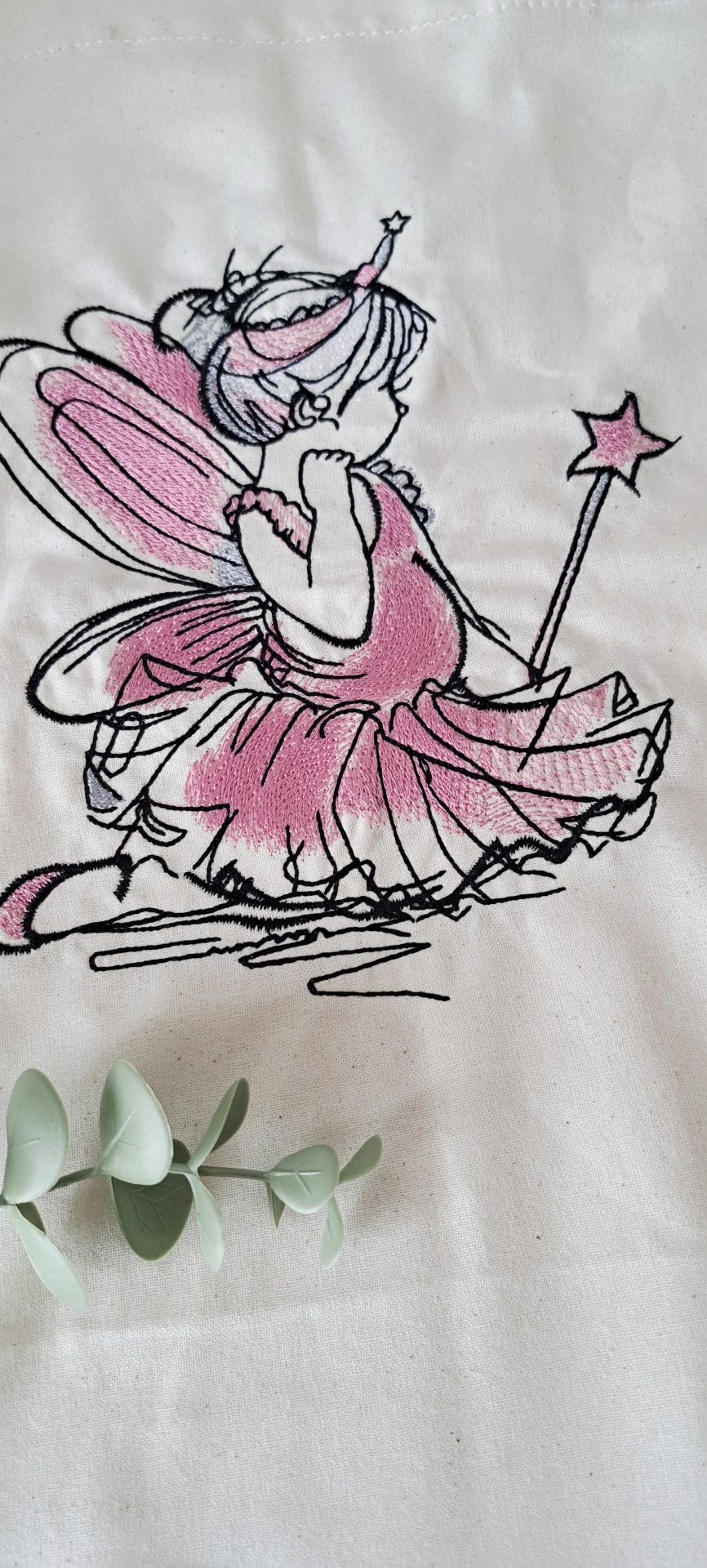 Saco de tecido cru com ilustração de fada menina bordada em preto e rosa.