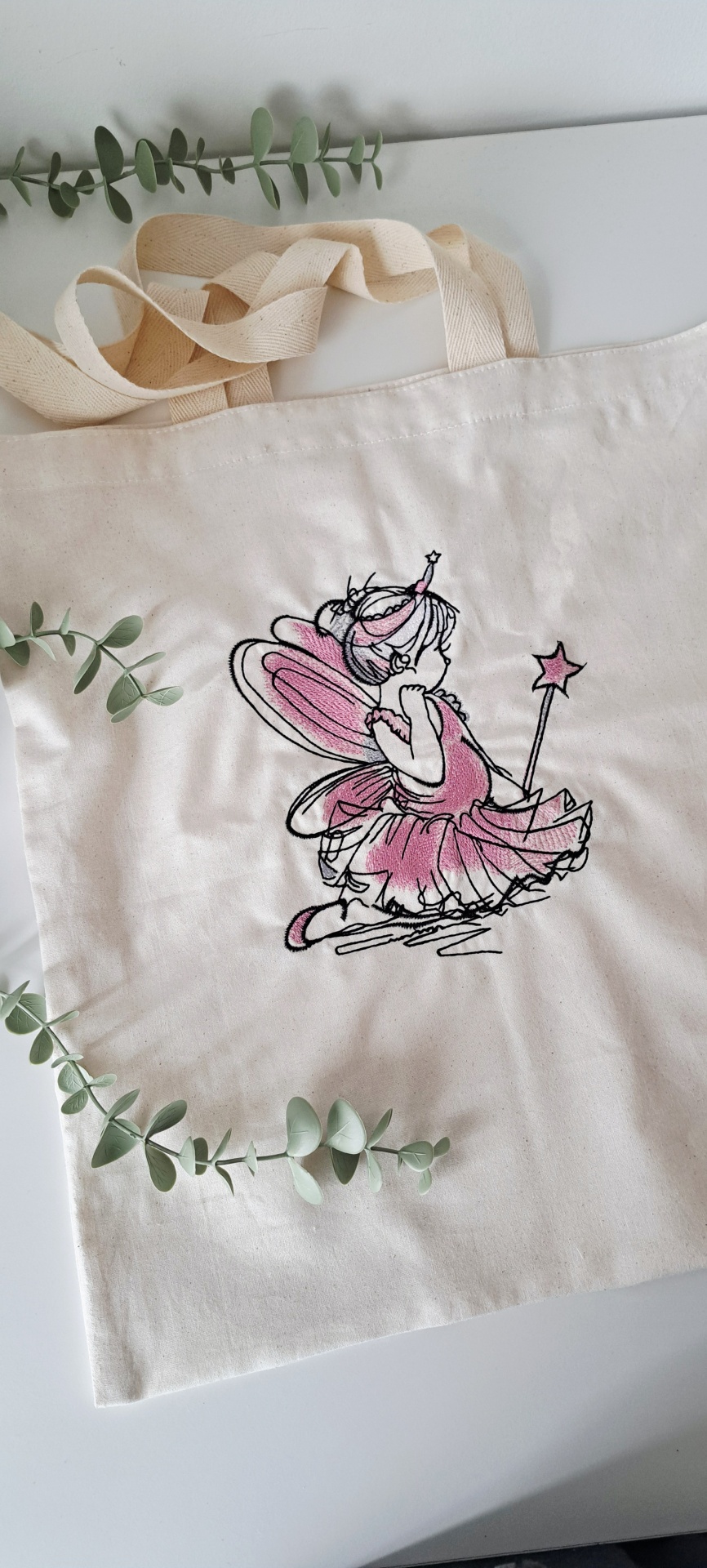• Saco de tecido cru com ilustração de fada menina bordada em preto e rosa.