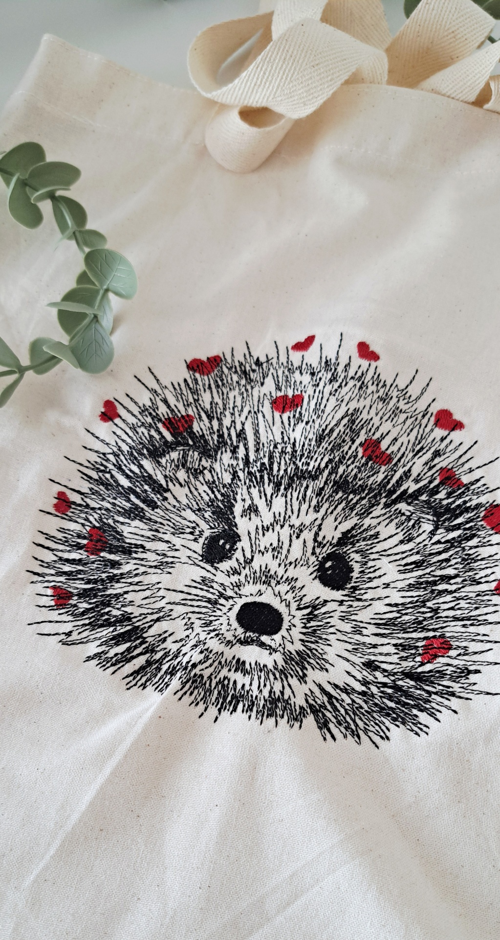 • Saco de tecido com ilustração de ouriço com corações vermelhos