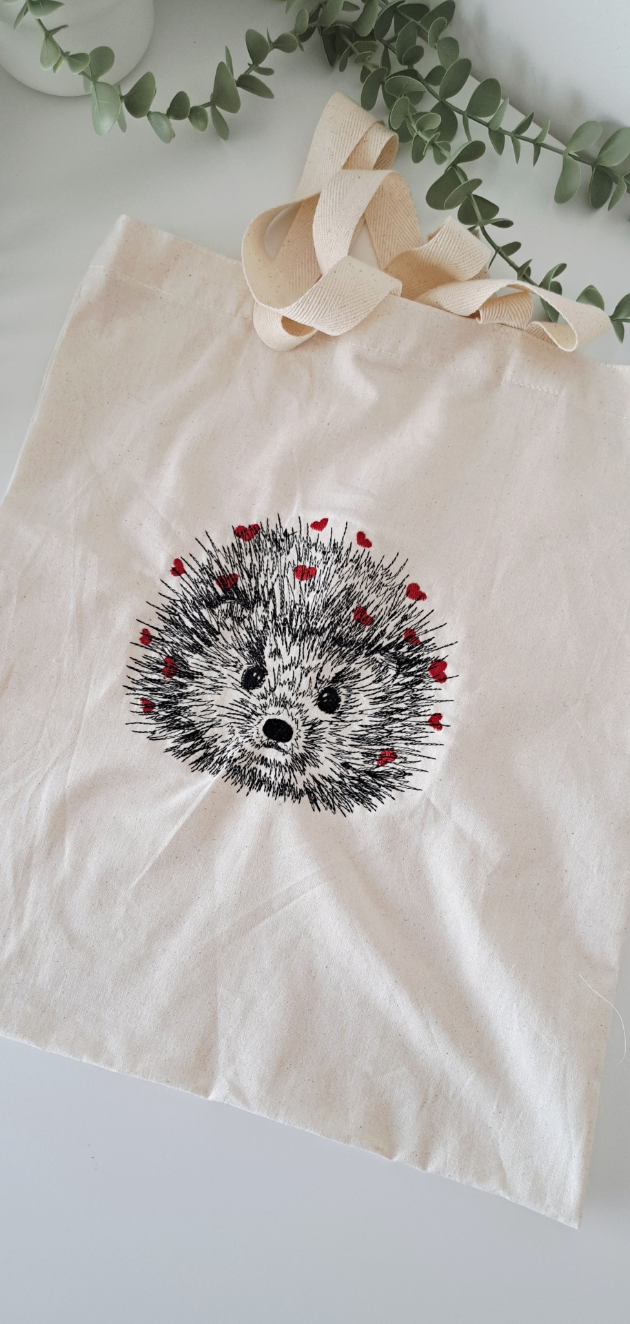 Leve, prático e cheio de charme! Este saco tote em algodão cru apresenta uma ilustração de um ouriço com corações.