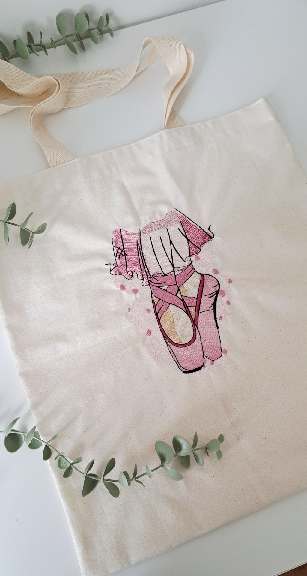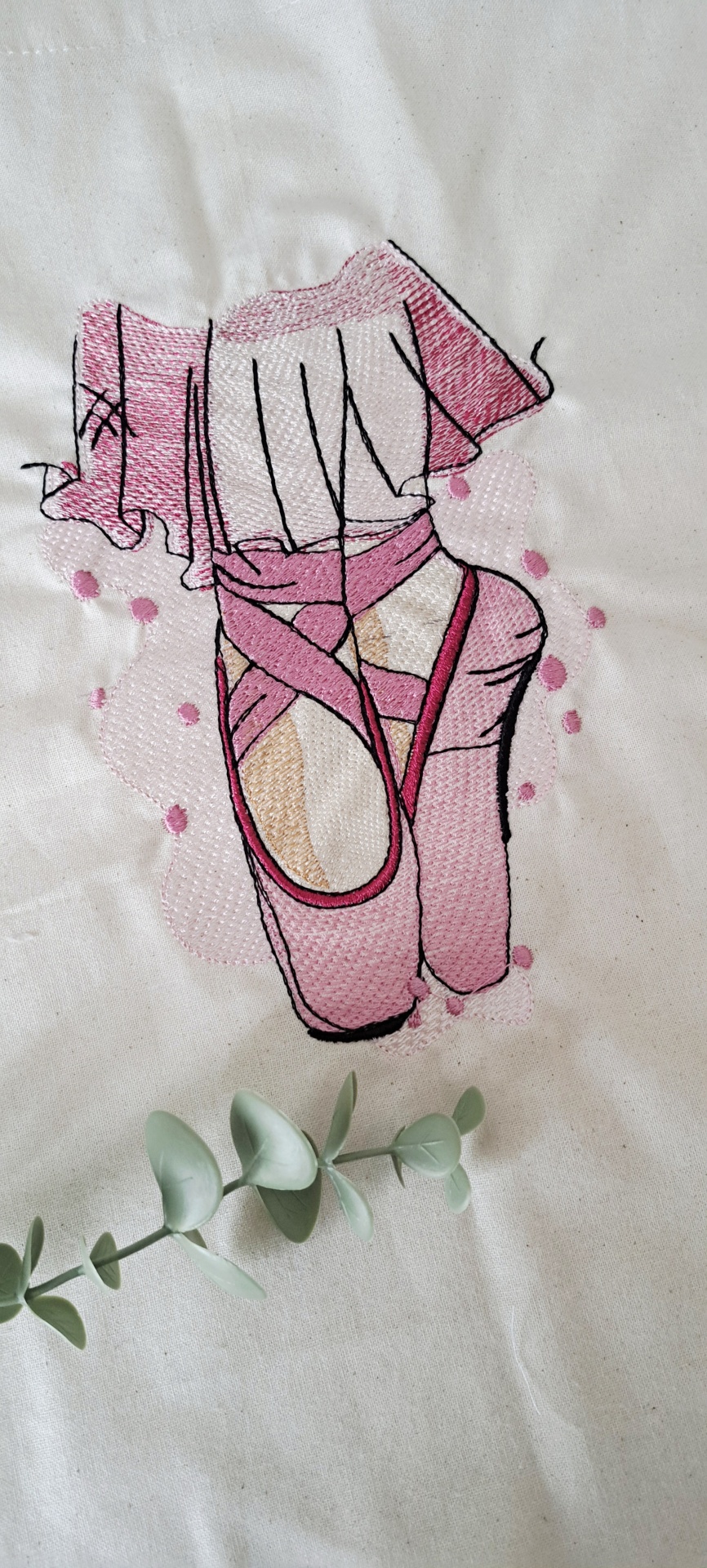 • Bordado de pés de bailarina com sapatilhas cor de rosa em tecido branco, com ramo de folhas verdes abaixo.