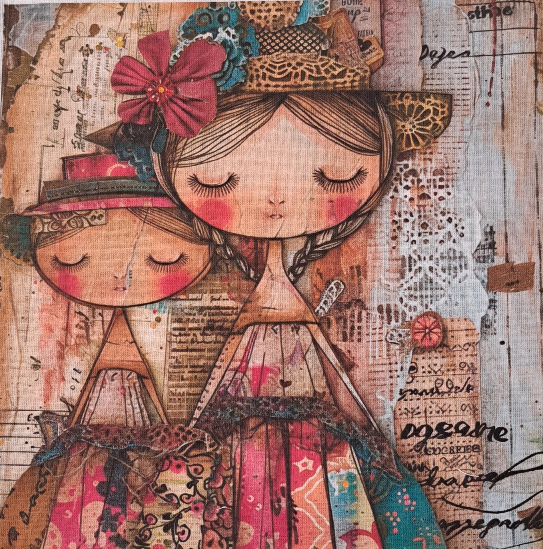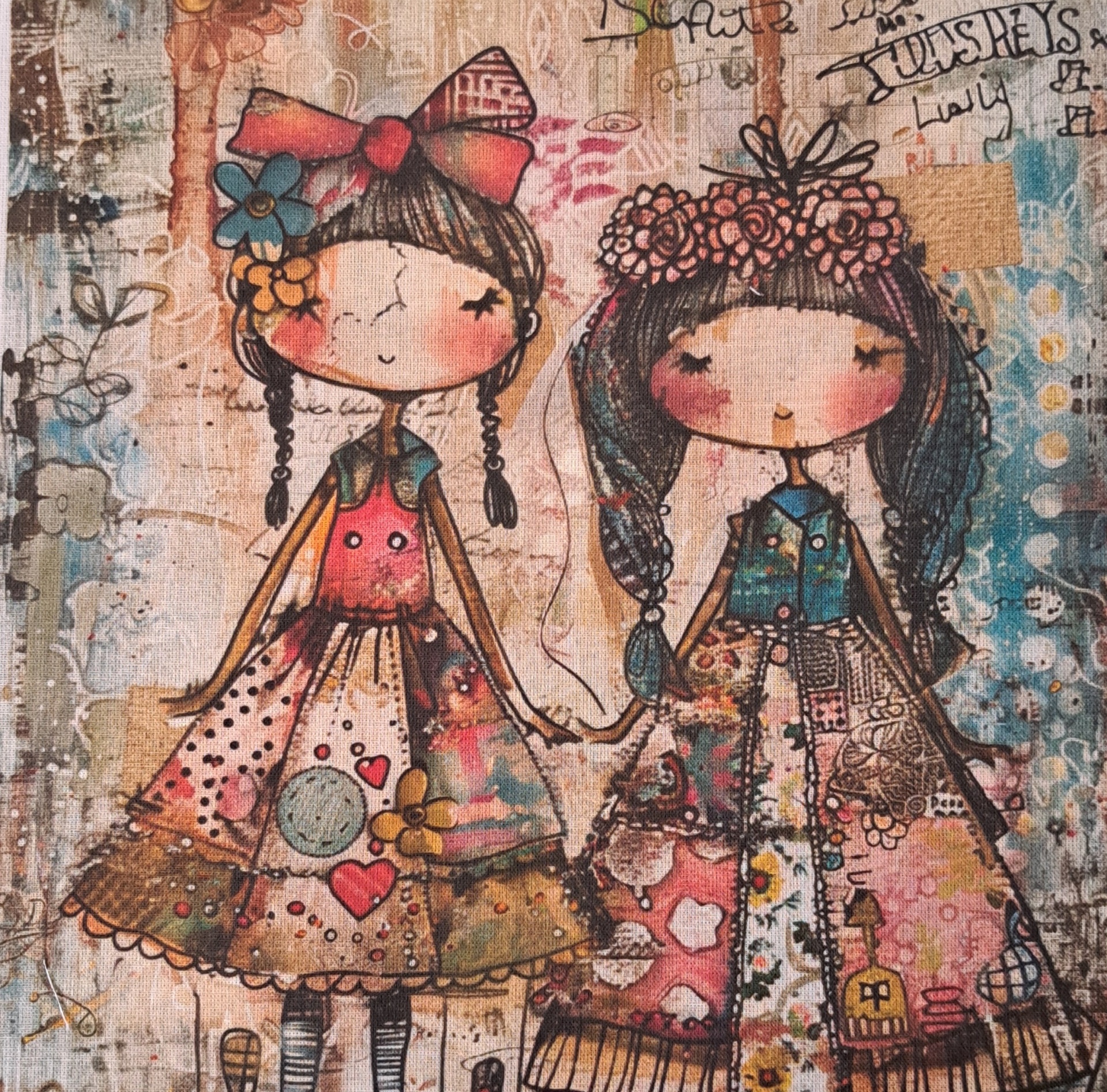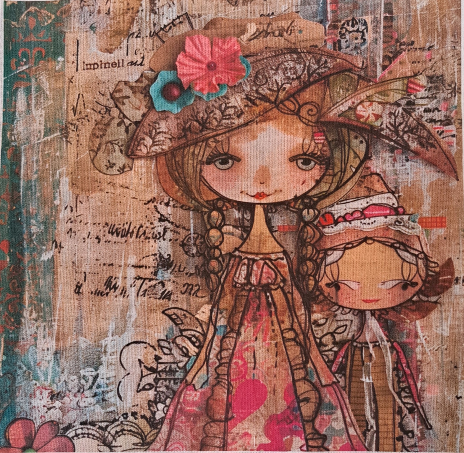 • Pintura em tecido de duas raparigas infantis com vestidos coloridos e chapéu com flores