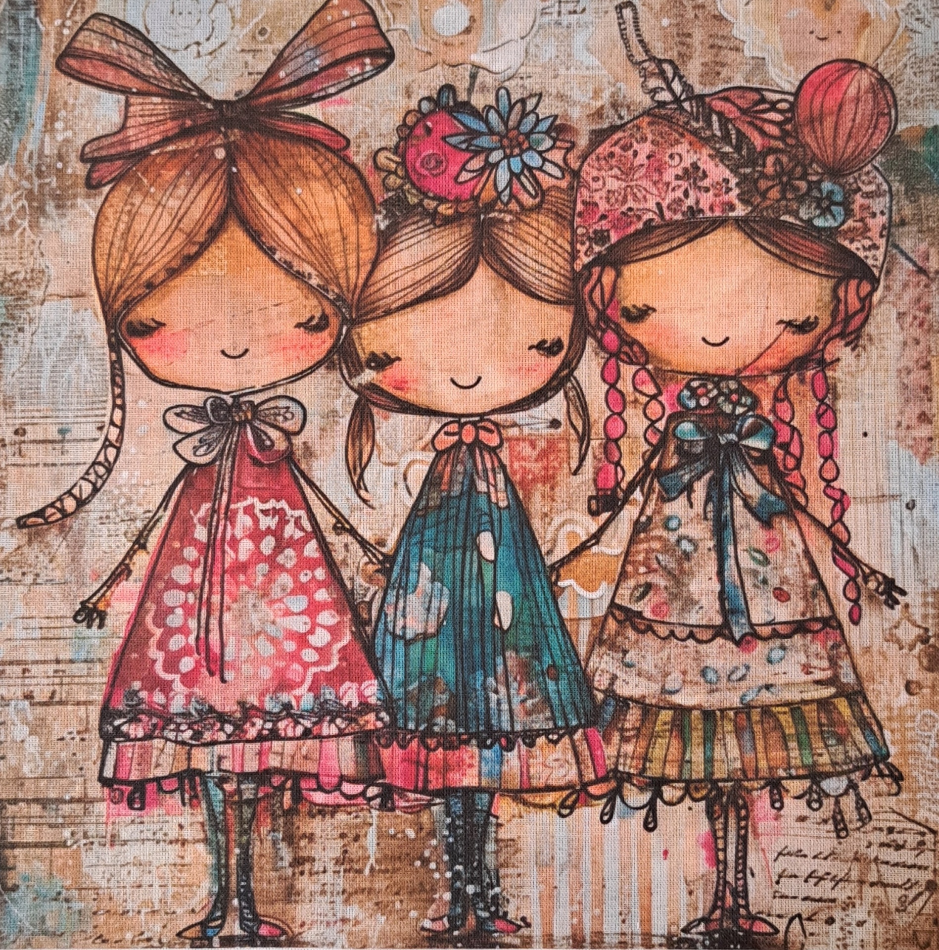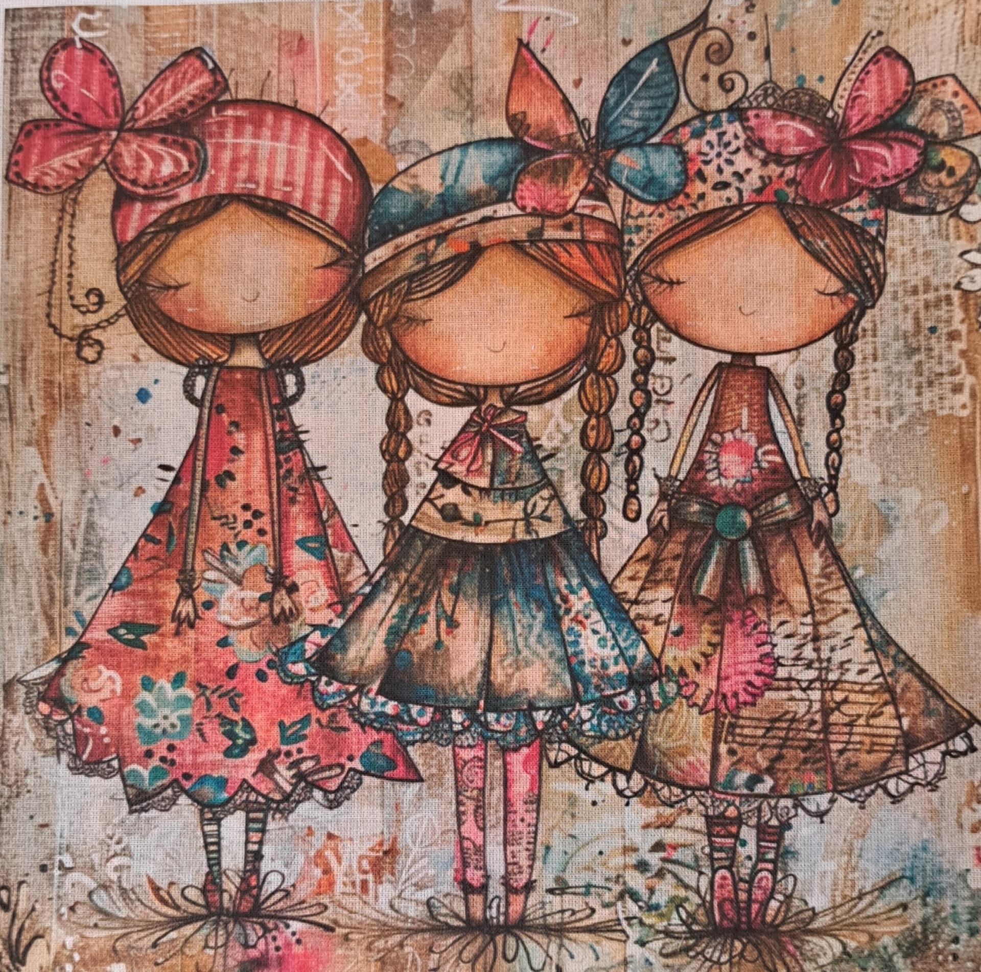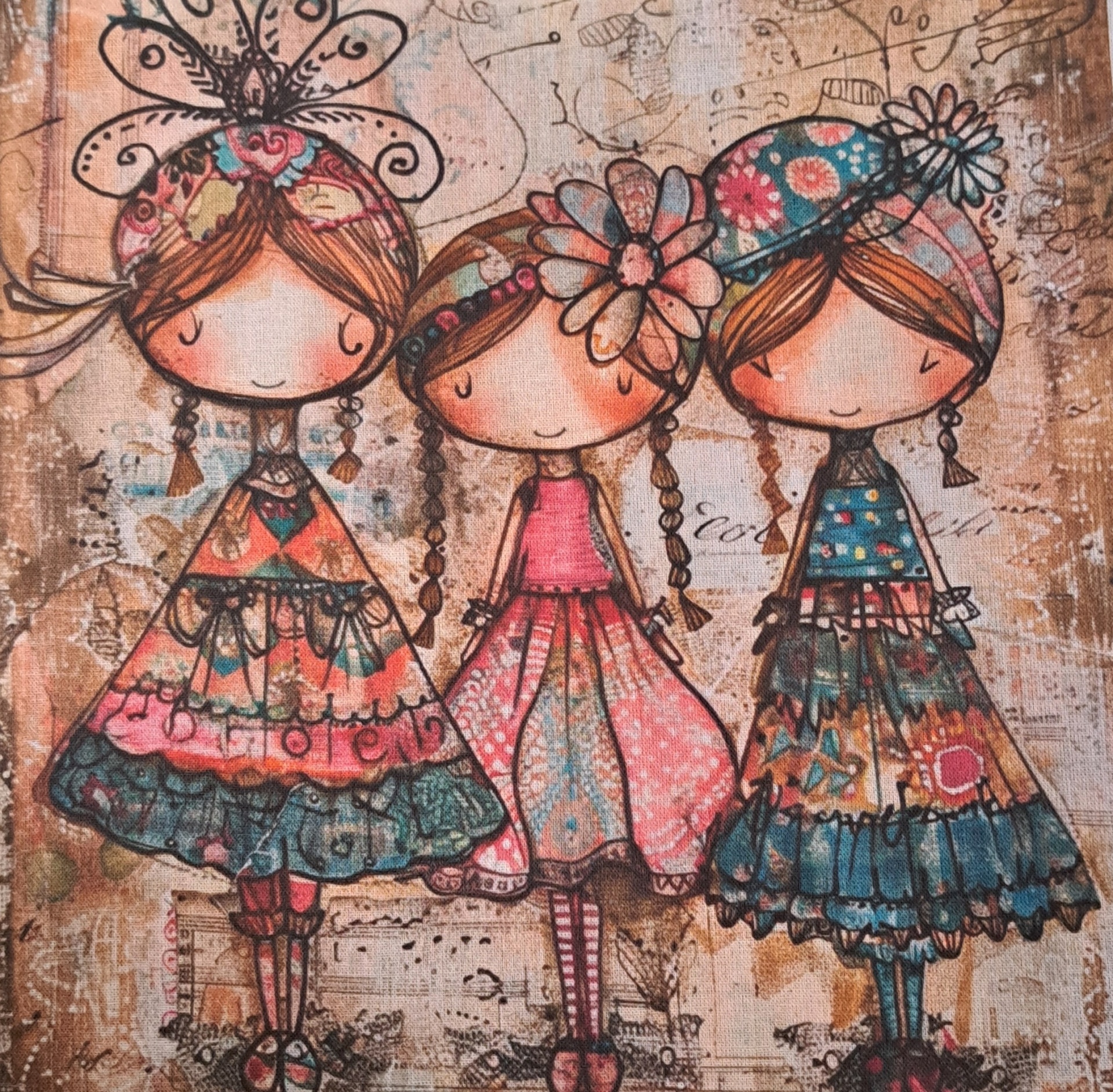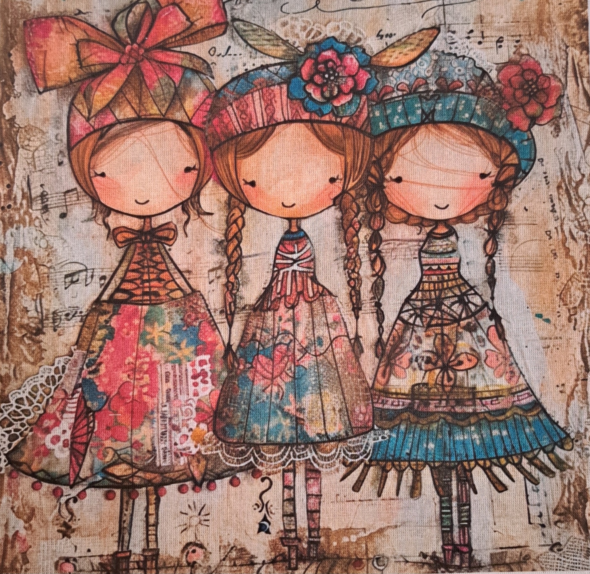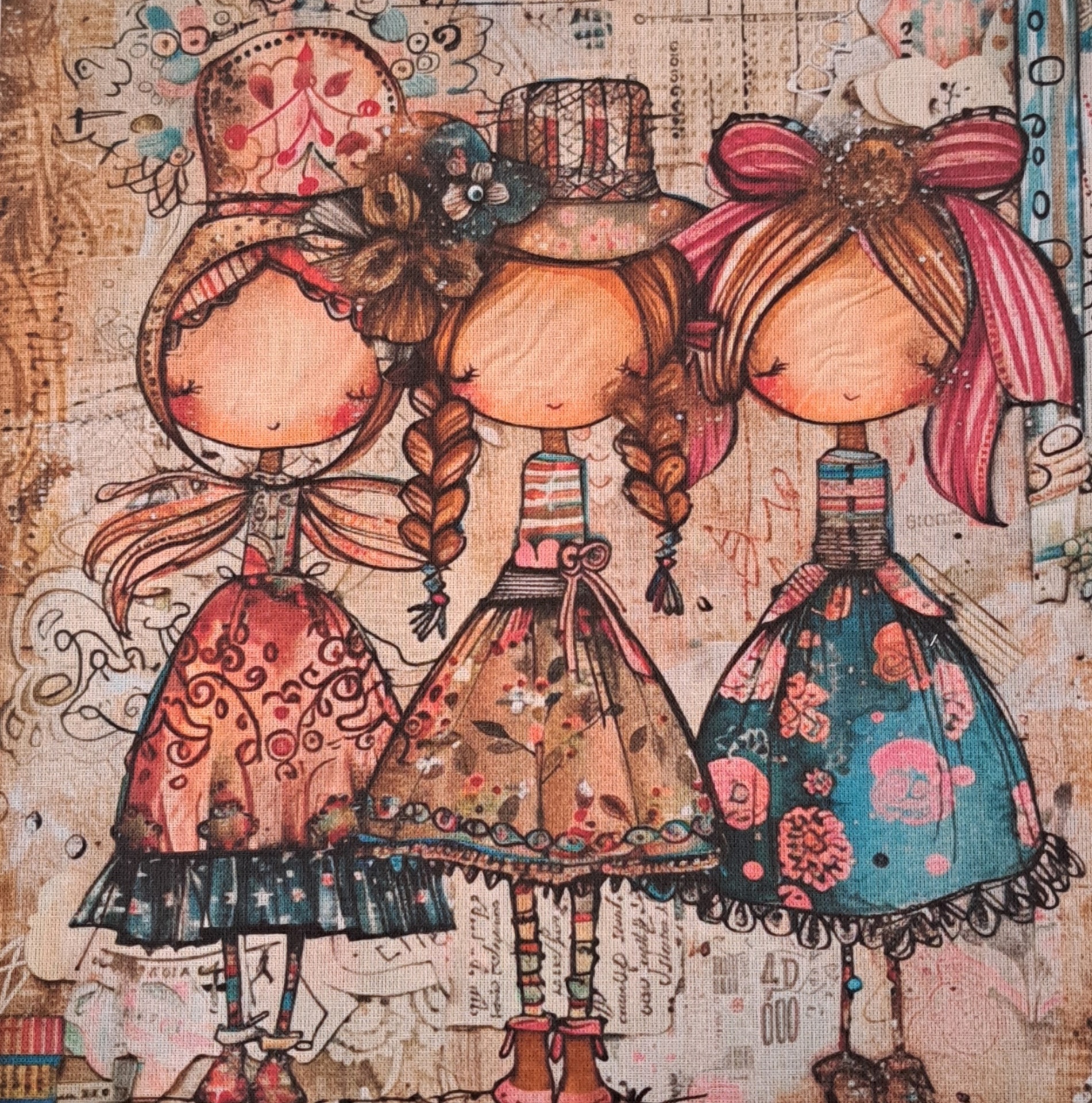 • Tela com três bonecas coloridas em estilo infantil com vestidos floridos e laços na cabeça