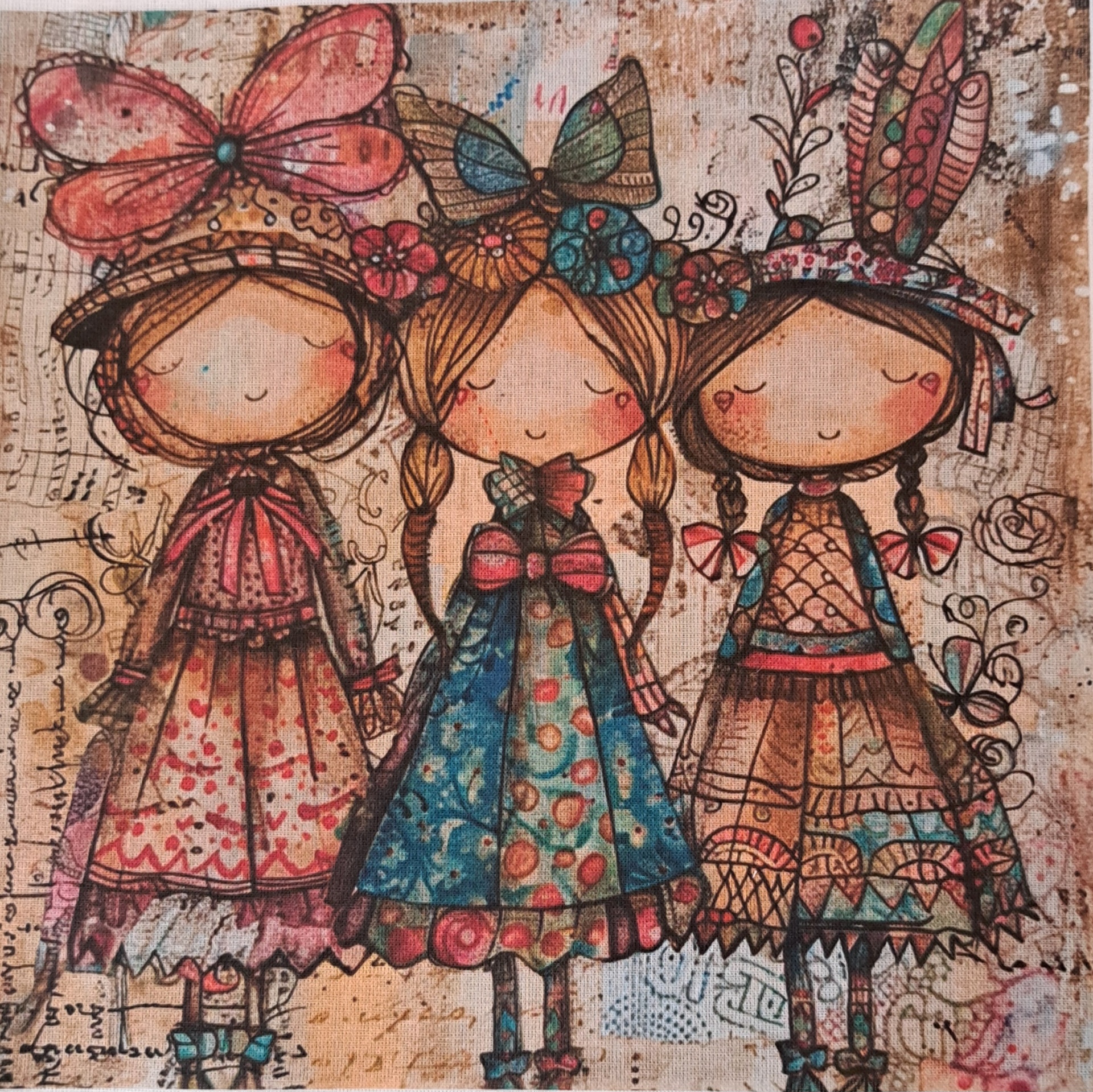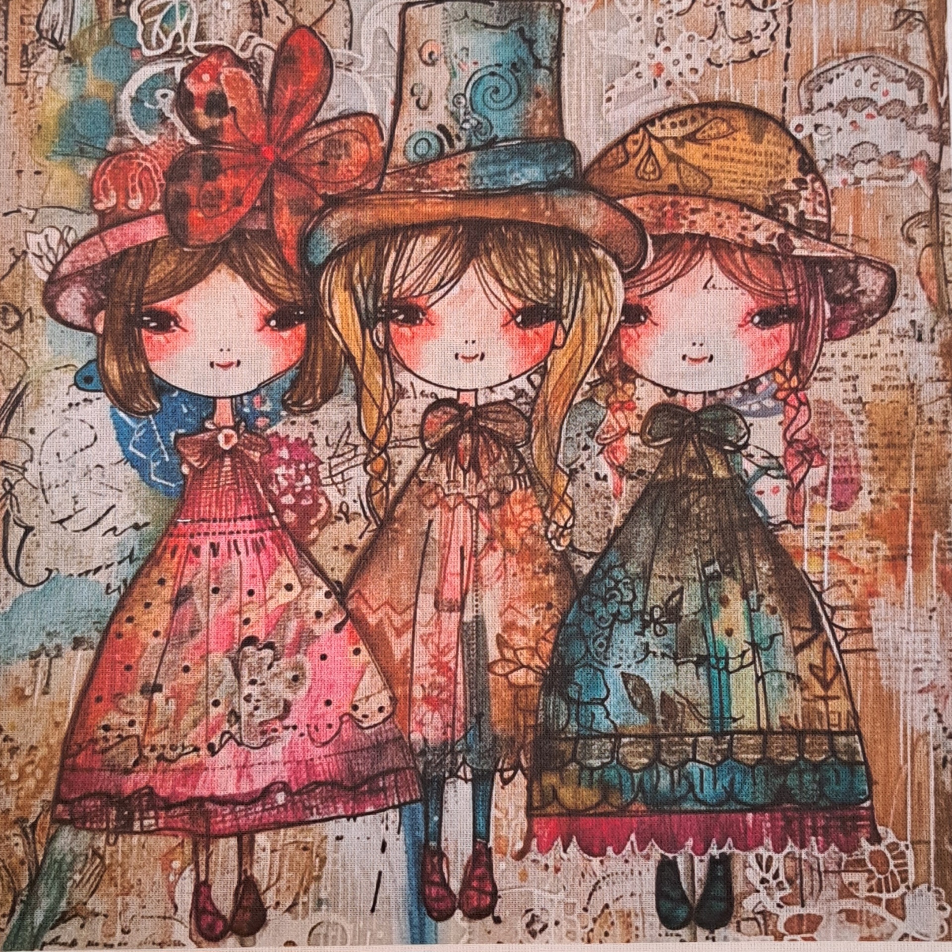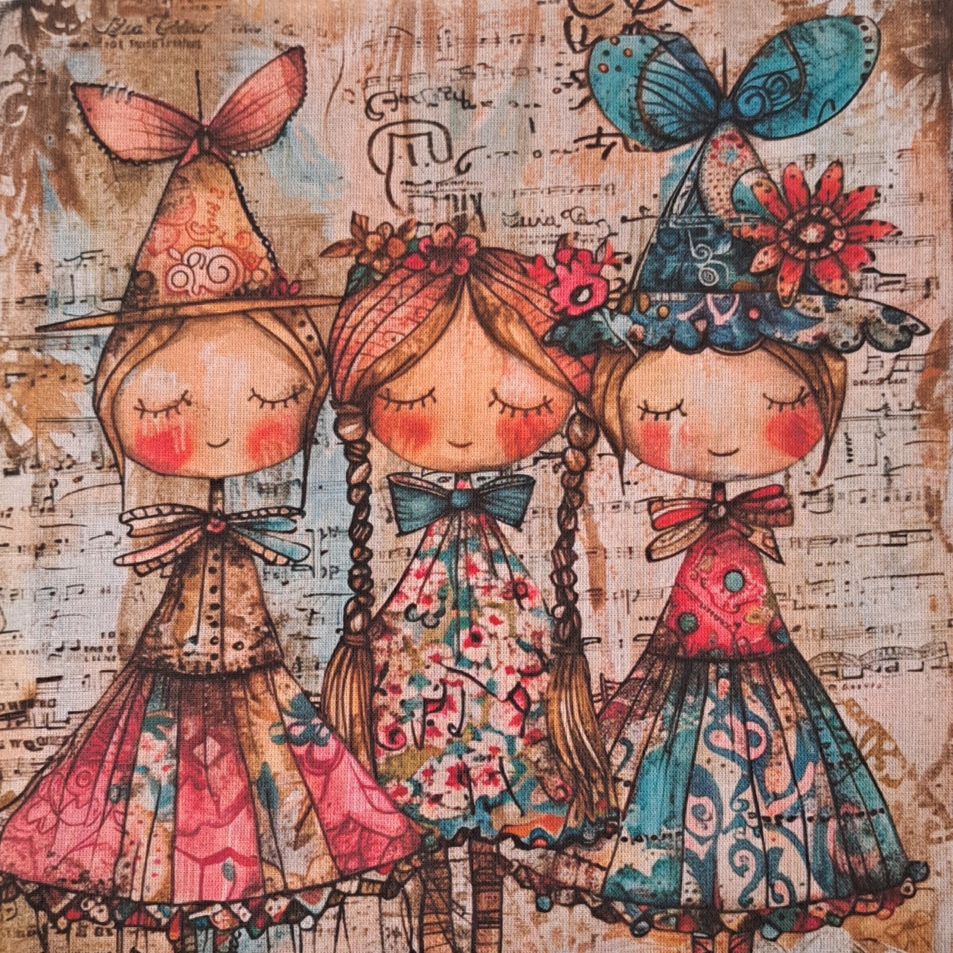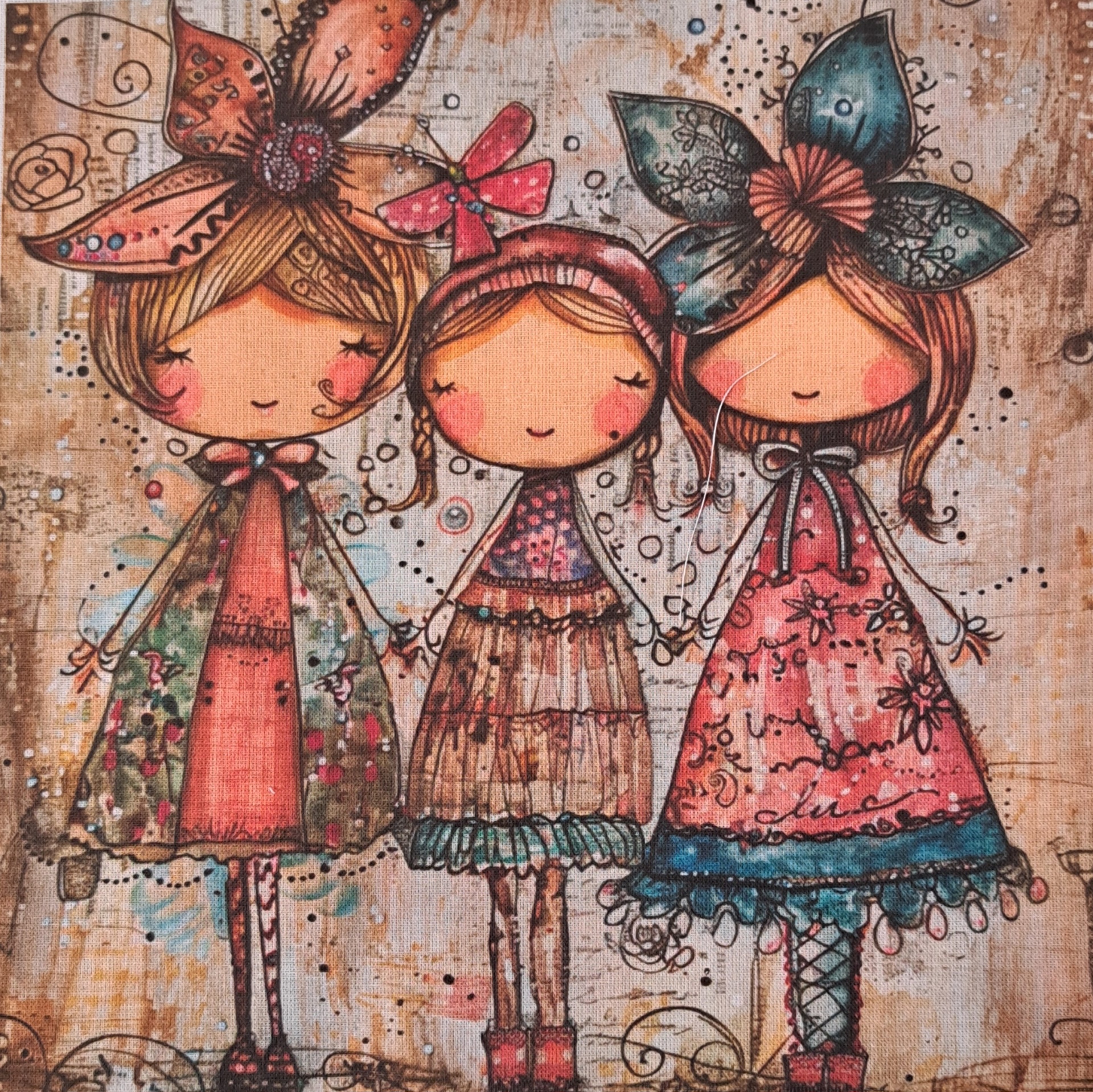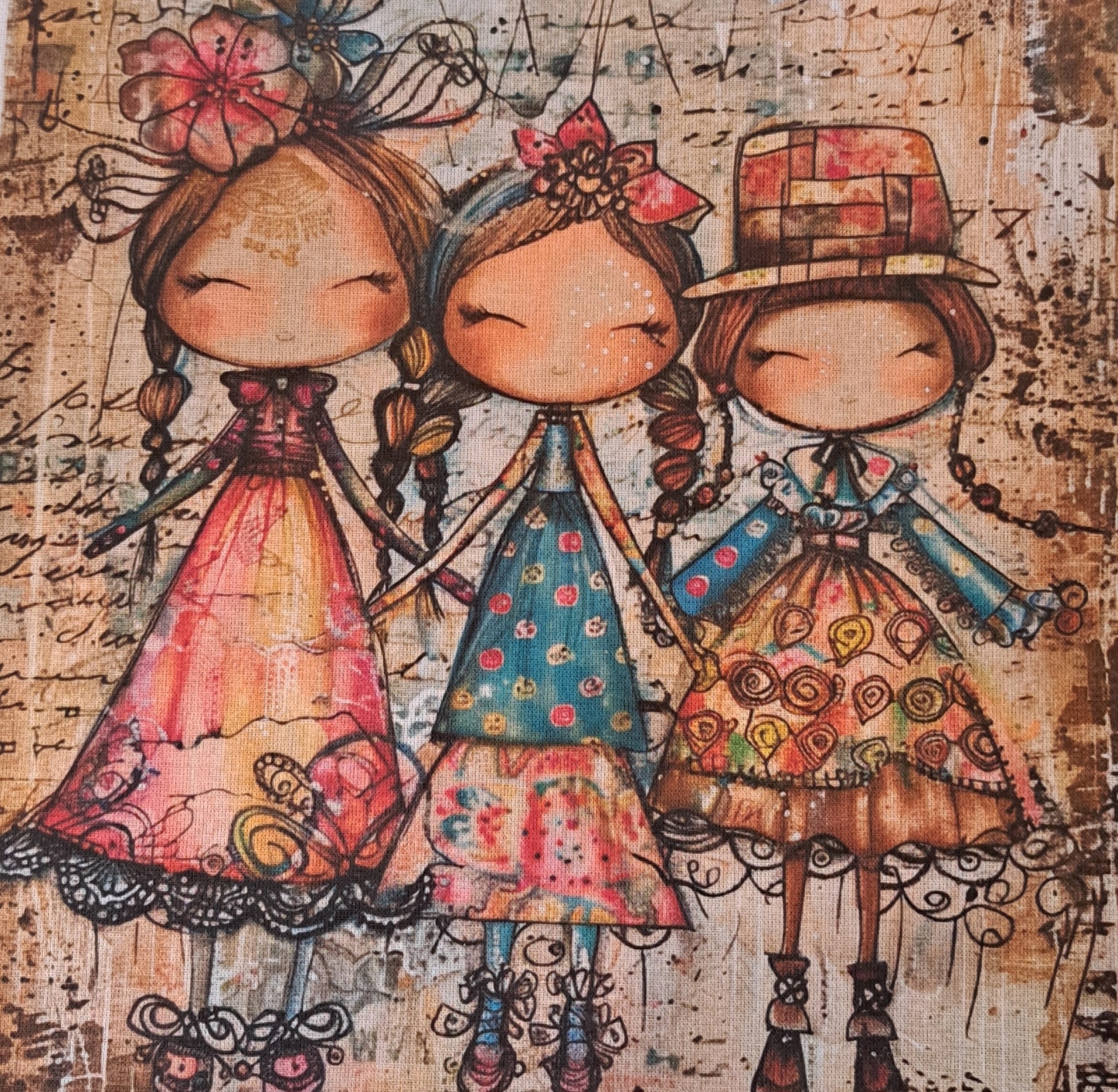 • Tela com três bonecas coloridas em estilo infantil com vestidos floridos e laços na cabeça