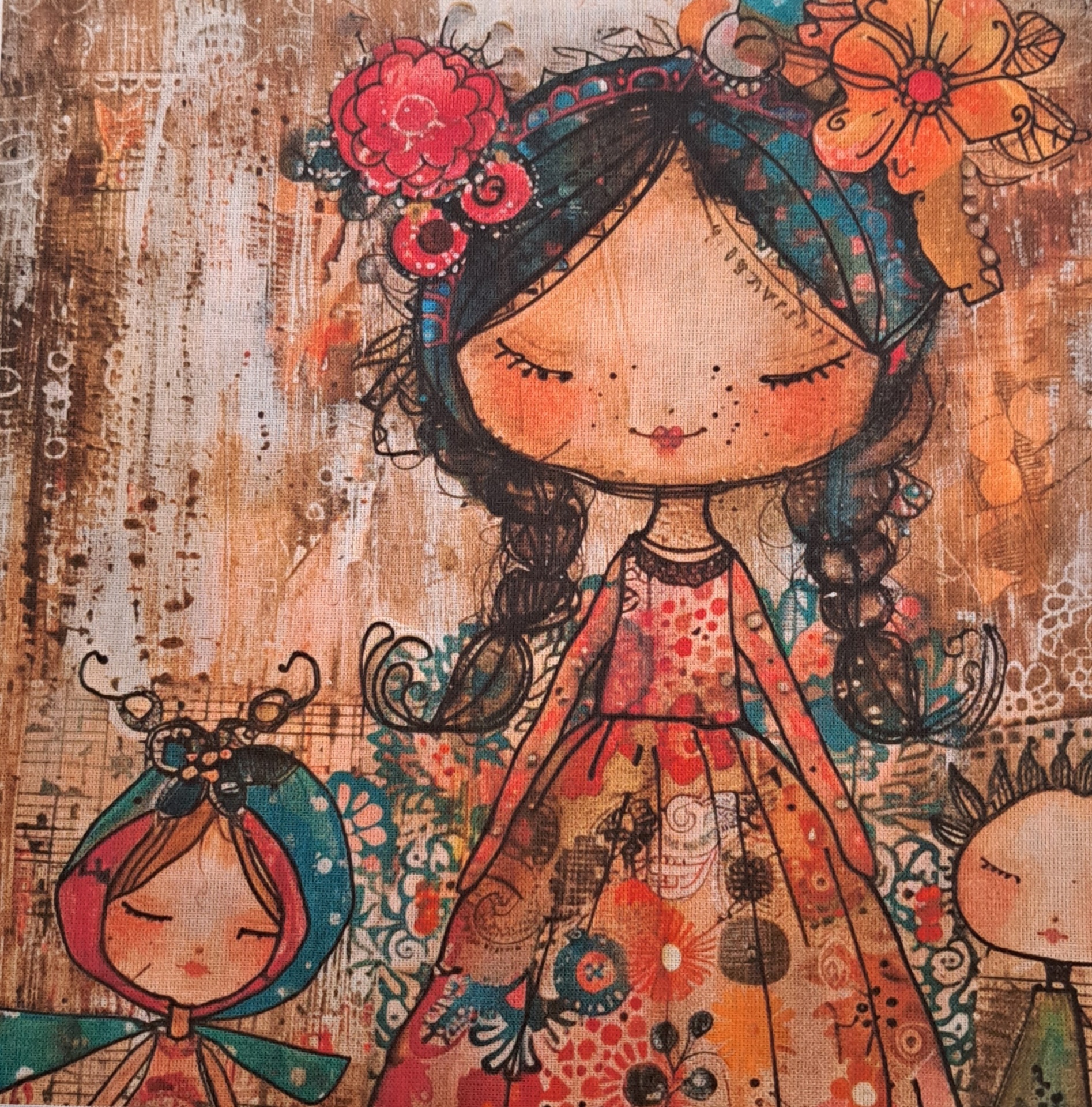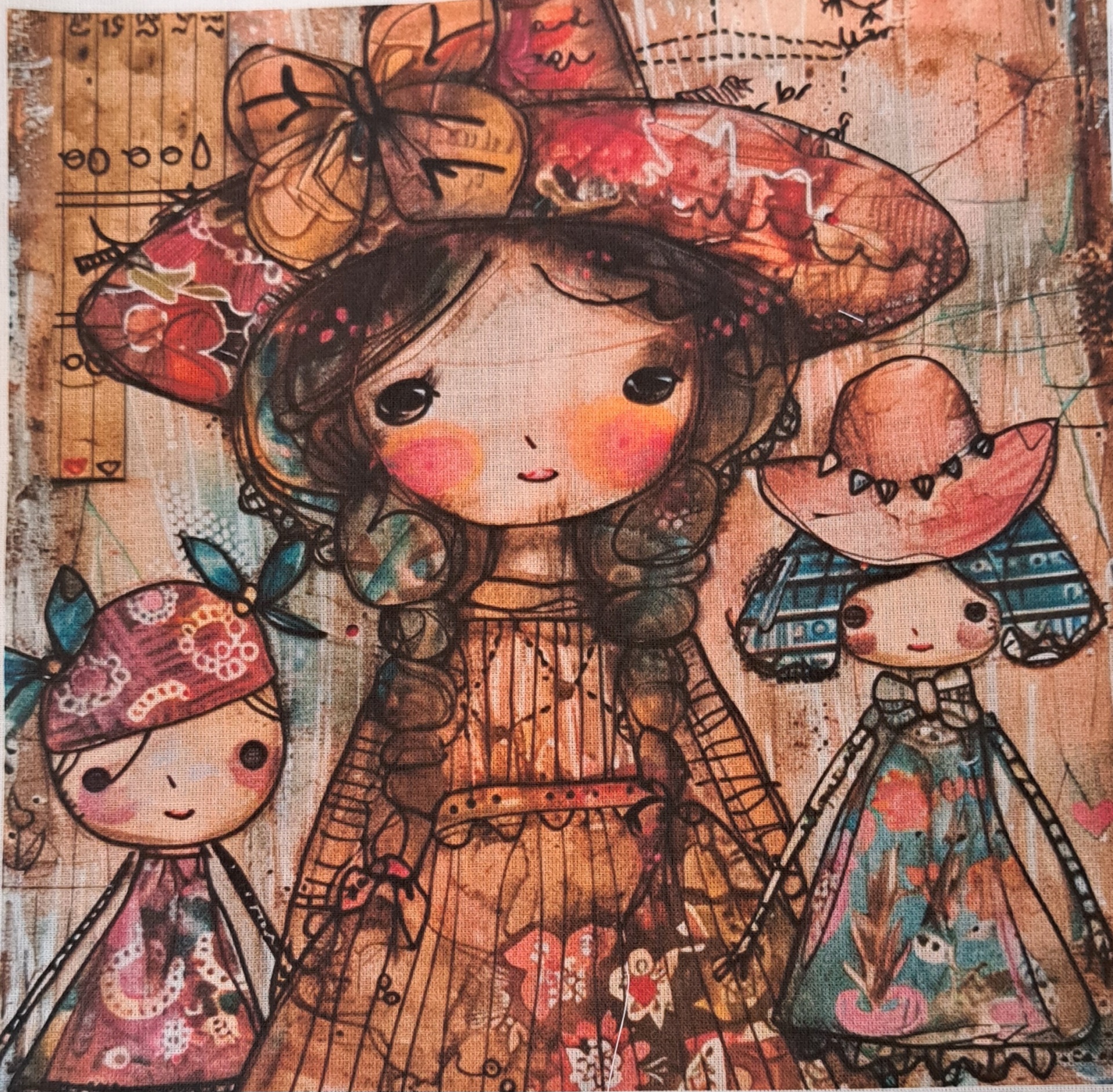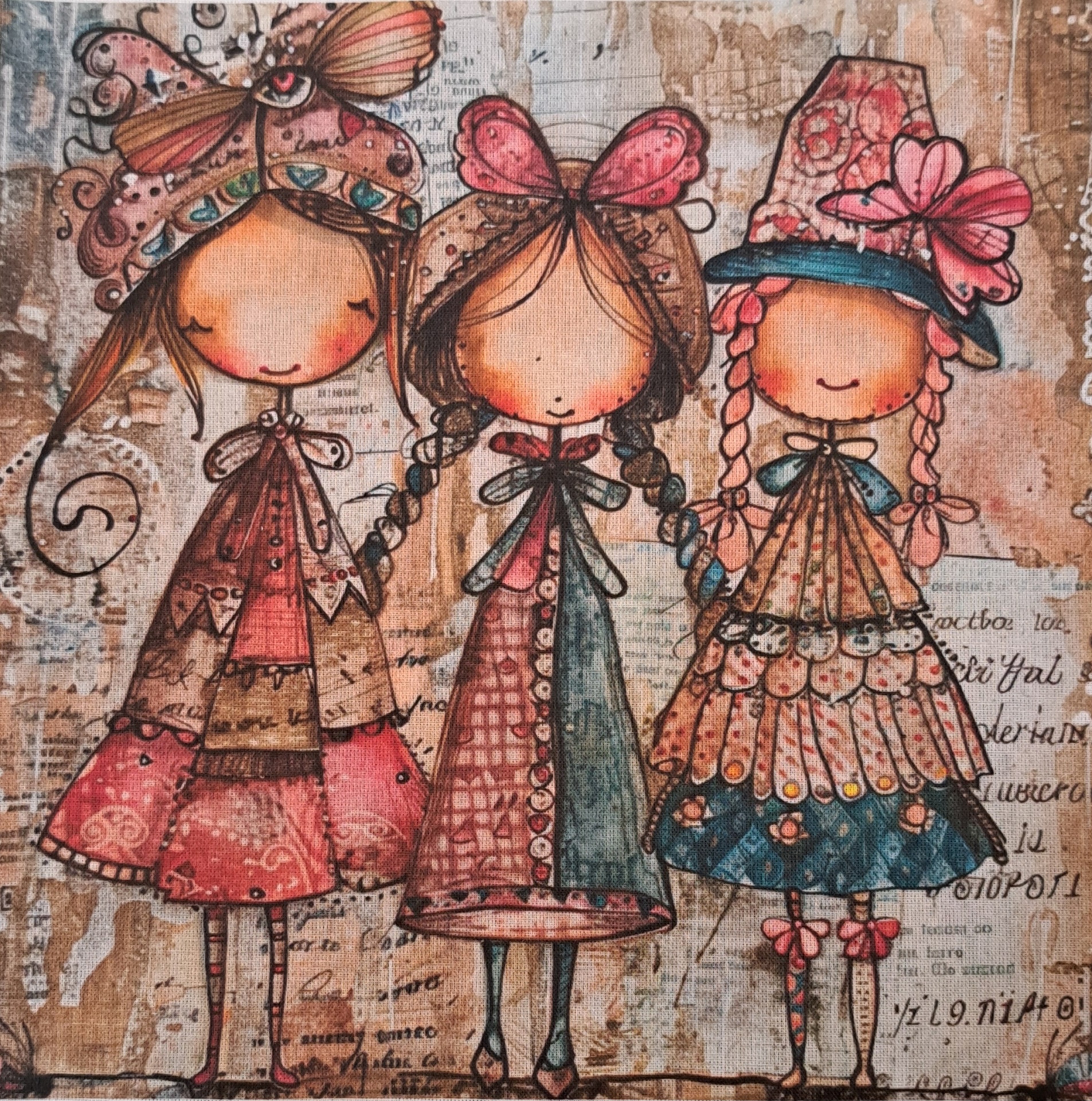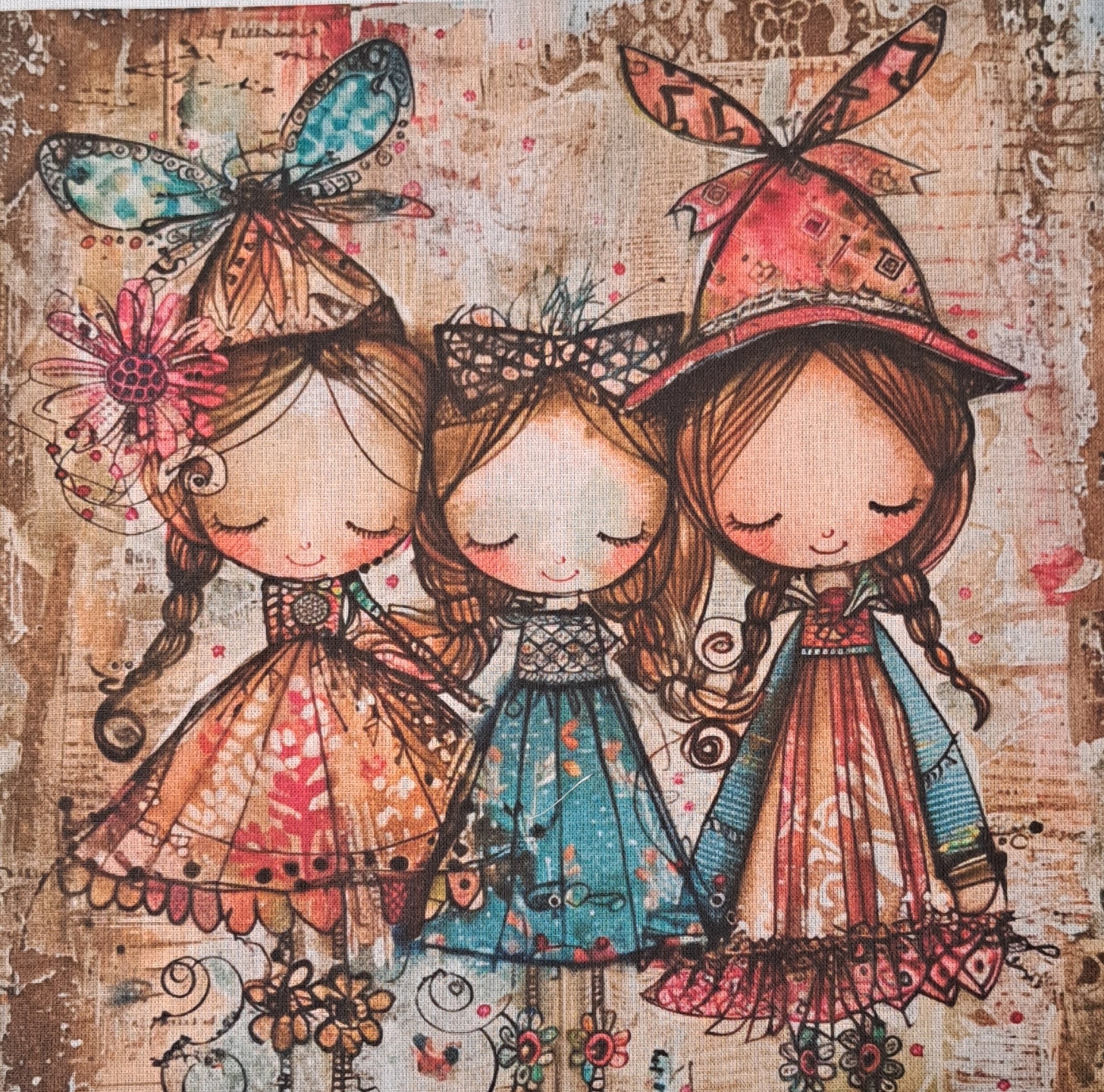 • Pintura com três bonecas infantis coloridas com roupas e chapéus detalhados em fundo com padrões terra