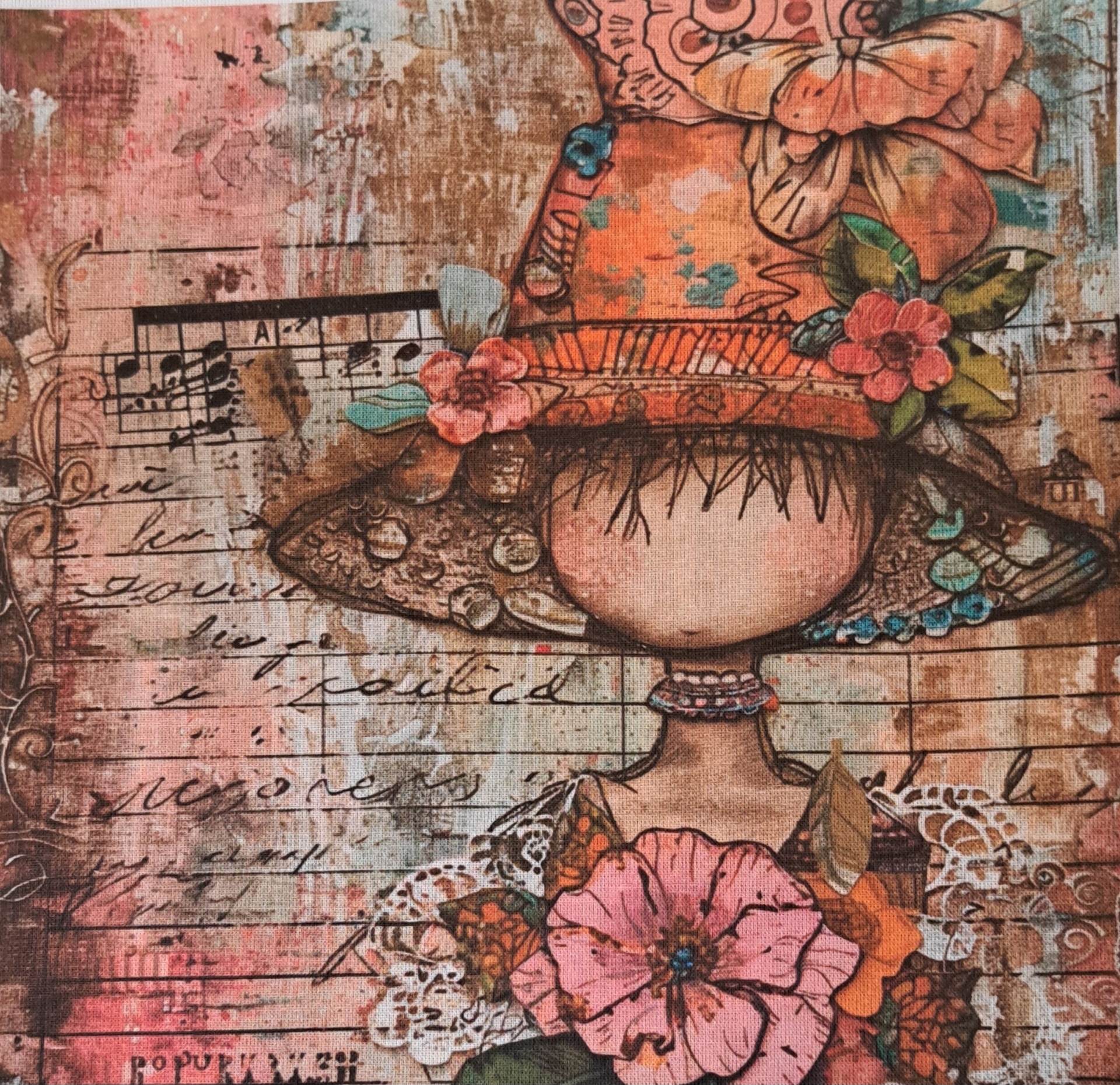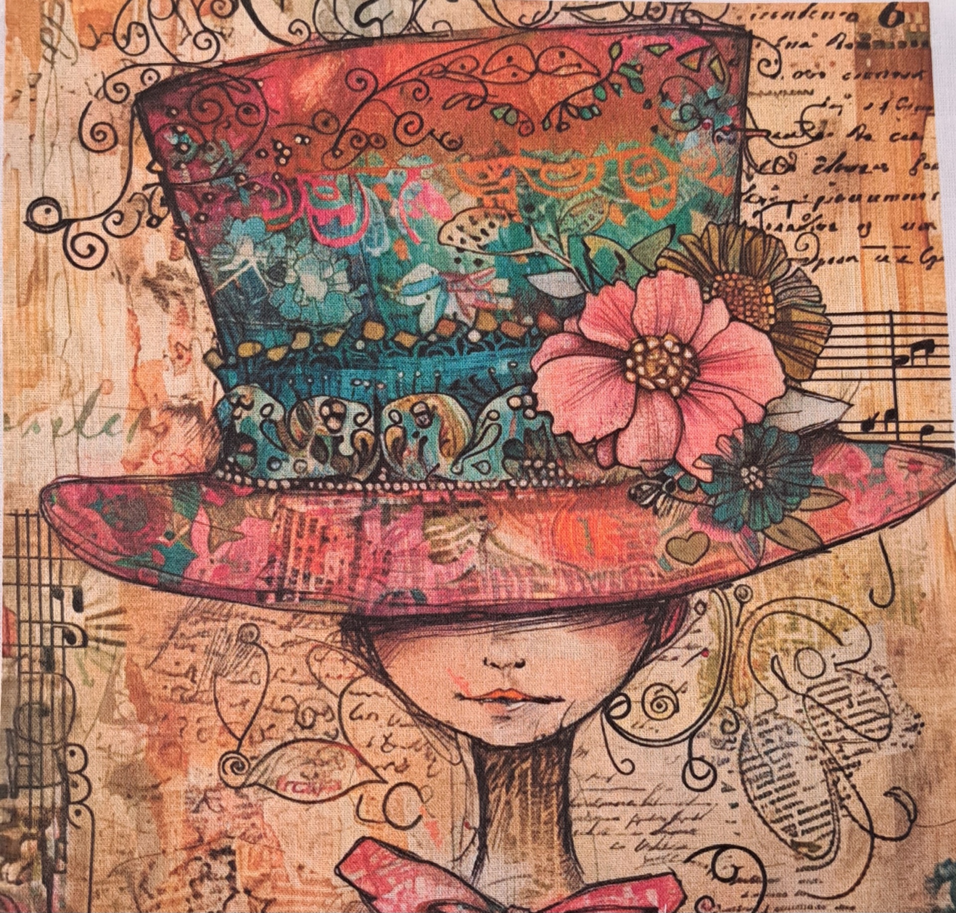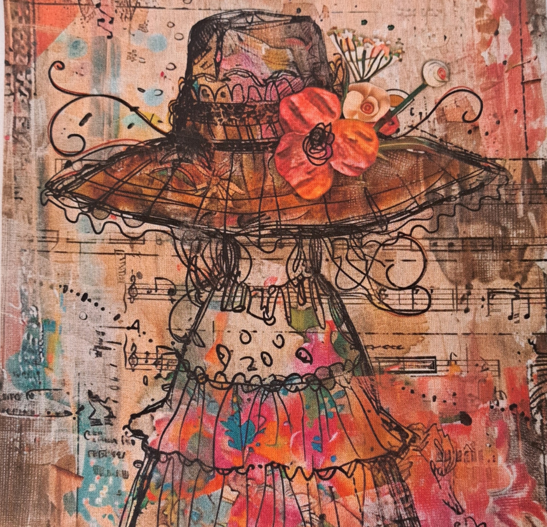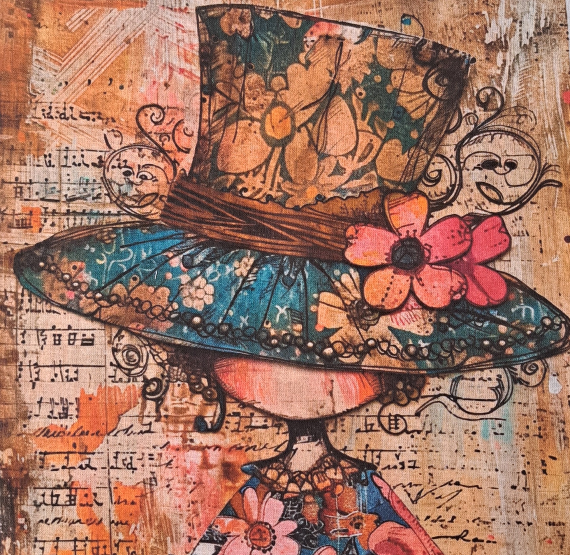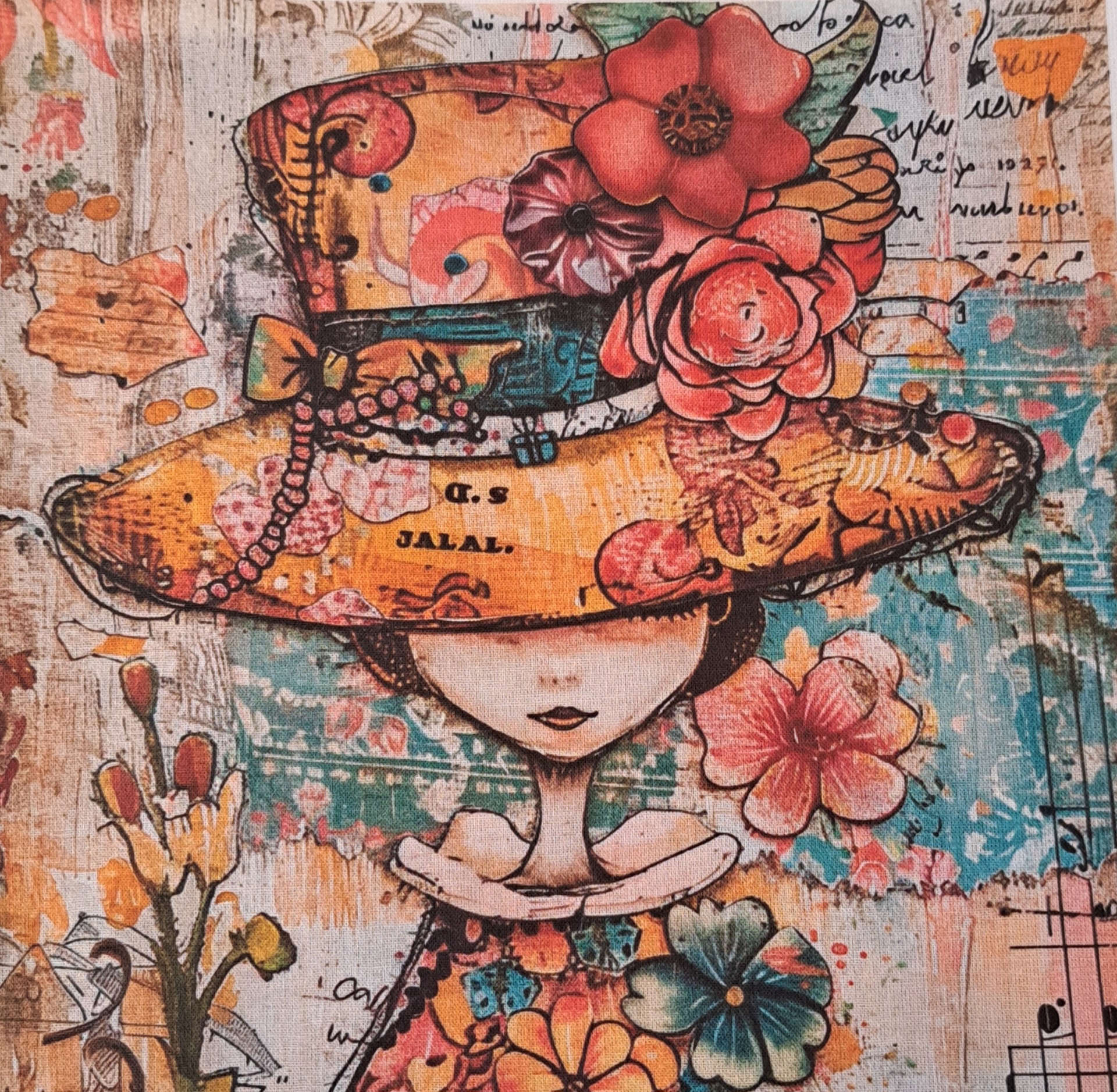 • Ilustração de figura com chapéu floral colorido e fundo com texto manuscrito e notas musicais