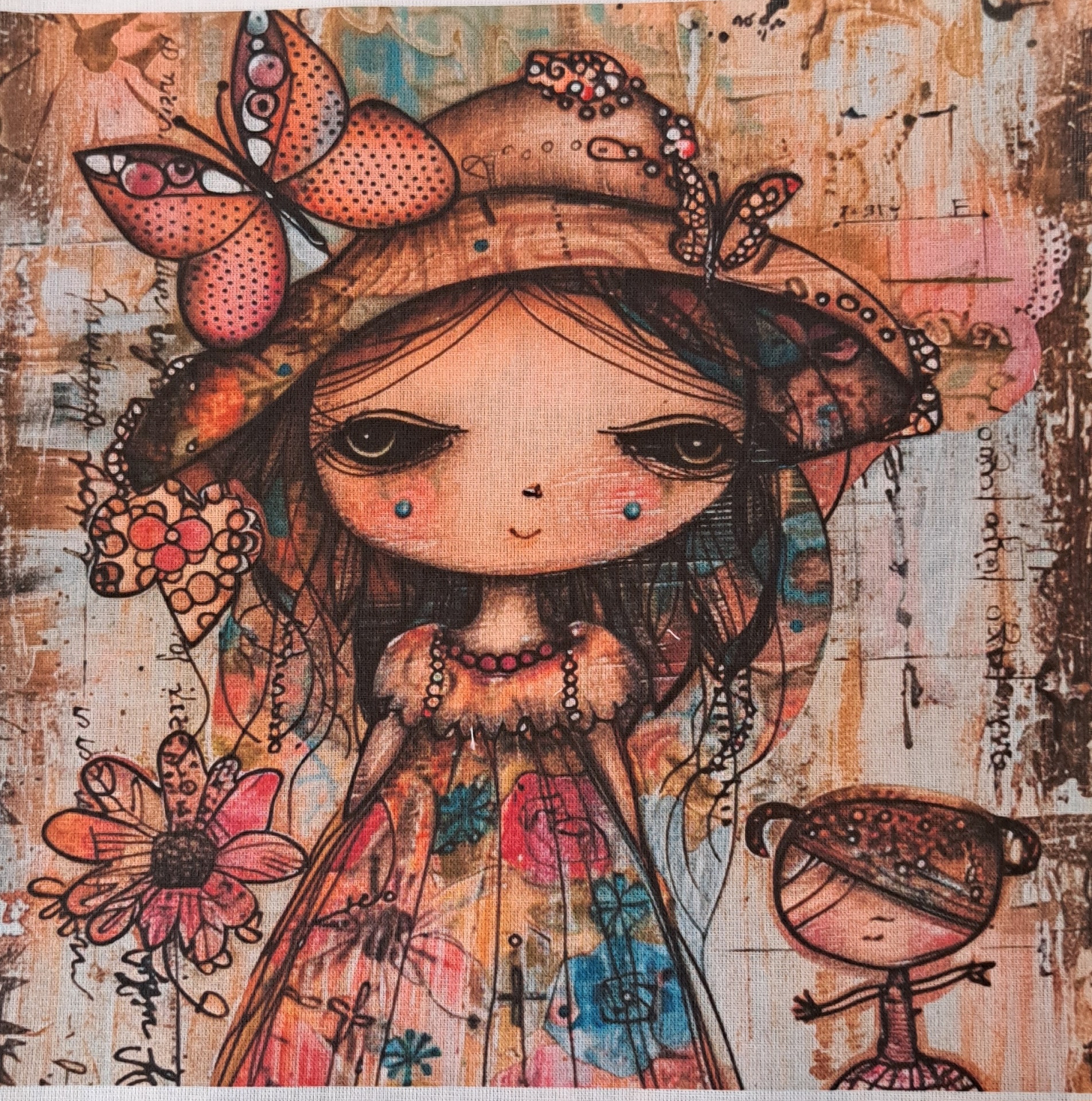 • Desenho colorido de rapariga com vestido floral e chapéu com borboletas, ao lado de boneco pequeno