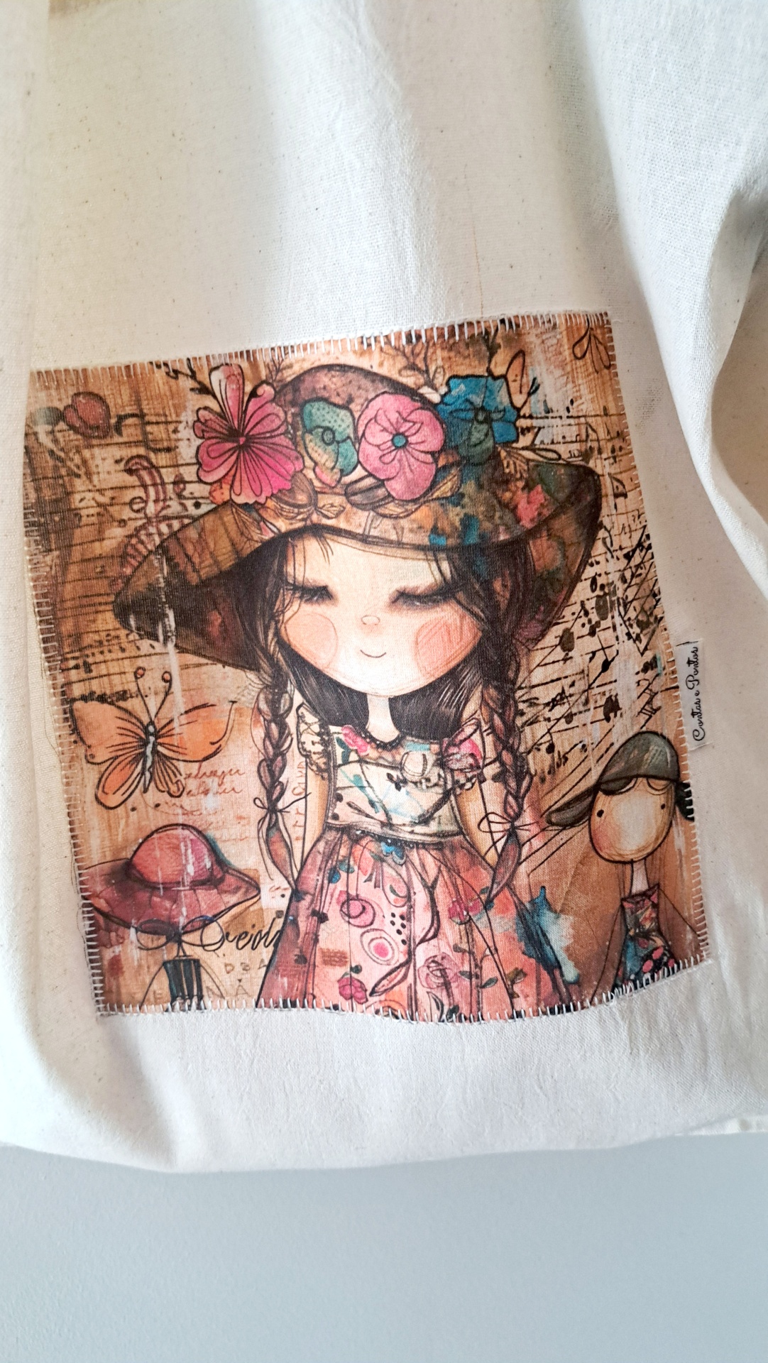 Saco de pano bege com imagem colorida de menina e borboletas, pendurado na parede com flores rosas dentro