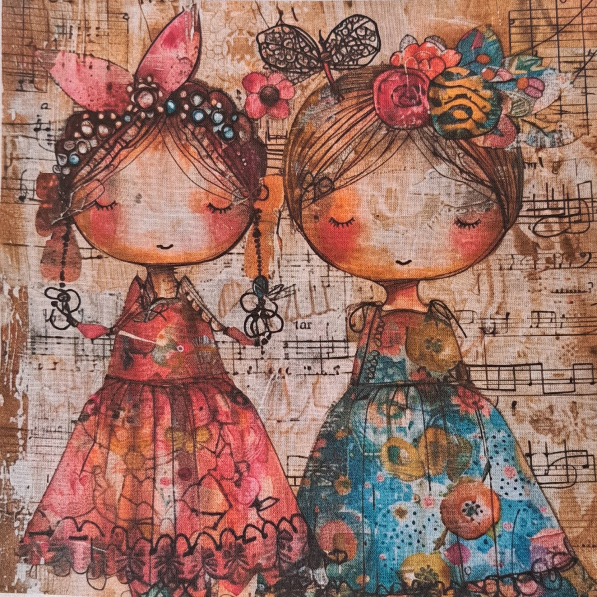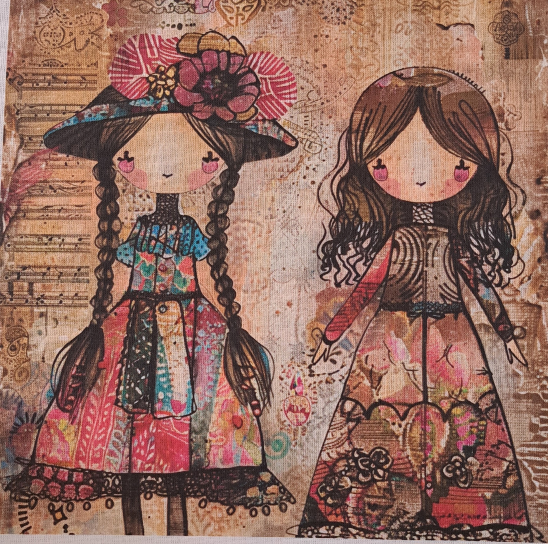 • Tecido com desenho de duas bonecas coloridas com vestidos florais e fundo com partituras