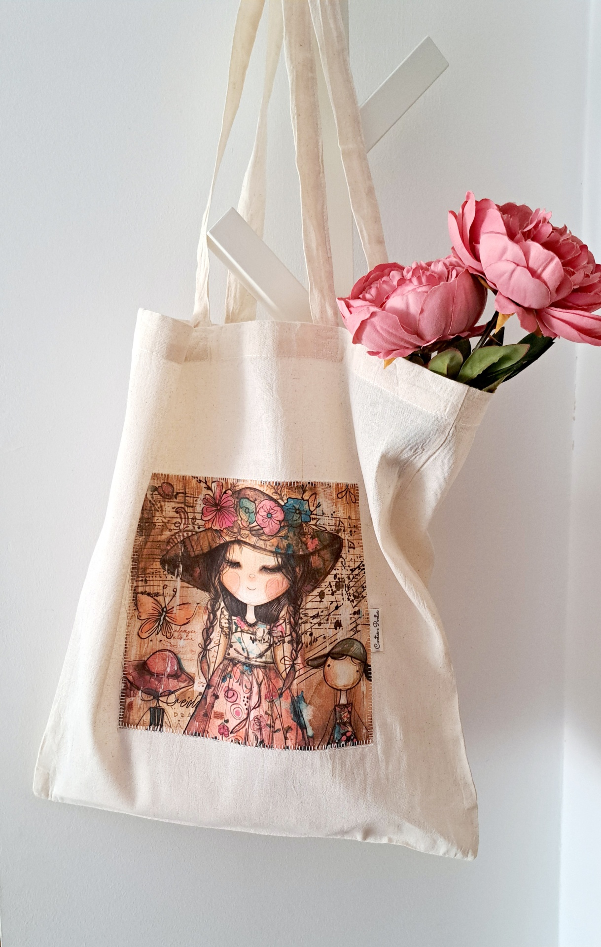 • Saco de pano bege com imagem colorida de menina e borboletas, pendurado na parede com flores rosas dentro